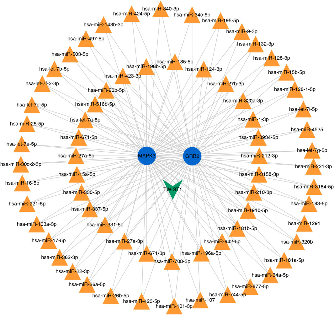 Network diagram illustrating interactions between miRNAs and target genes. Orange triangles indicate various miRNAs, while blue circles represent MAPK3 and GRB2 genes. A green triangle denotes TWIST1. Arrows connect miRNAs to their respective targets, showing regulatory relationships.