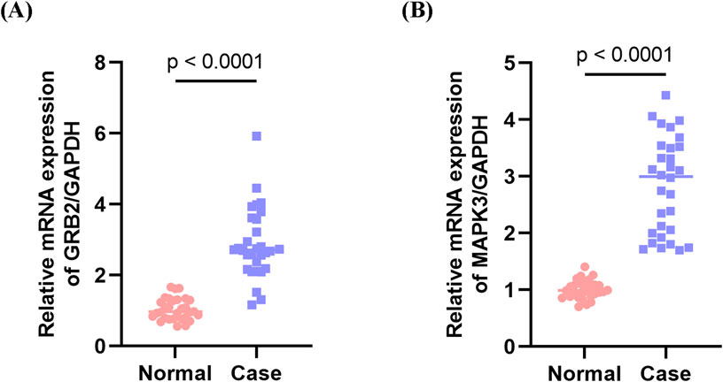 Graphs A and B show mRNA expression levels of GRB2/GAPDH and MAPK3/GAPDH, respectively. In both,