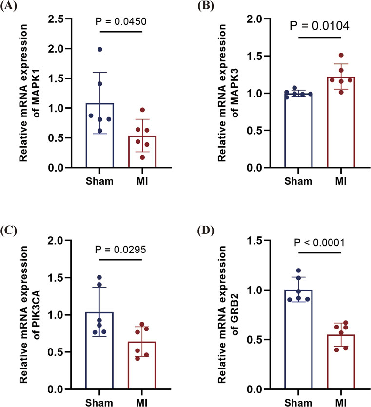 Figure 11. qPCR validation of candidate genes in mouse MI model. (A) MAPK1 downregulated in MI myocardium (P = 0.0450). (B), MAPK3 upregulated in MI tissue (P = 0.0104). (C) PIK3CA downward trend in MI (P = 0.0295). (D) GRB2 profoundly downregulated in MI (P < 0.0001). Data are presented as mean ± SD. Statistical significance was assessed by Student’s t-test (n = 6 per group).