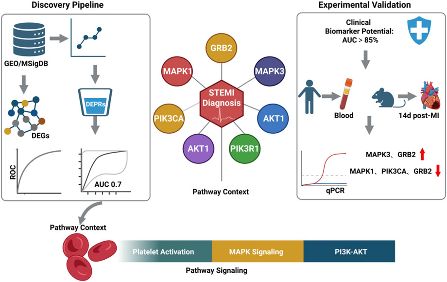 Flowchart illustrating a discovery pipeline and experimental validation for STEMI diagnosis. The discovery pipeline section shows databases like GEO/MSigDB leading to DEG identification and DEPR analysis, achieving AUC 0.7. It connects to pathway context, involving platelet activation and signaling pathways such as MAPK and PI3K-AKT. The experimental validation section suggests potential clinical biomarkers with AUC greater than 85%, involving blood samples processed 14 days post-myocardial infarction. The central hexagon indicates key genes like GRB2, MAPK1, and AKT1. Pathway signaling includes platelet activation, MAPK signaling, and PI3K-AKT.