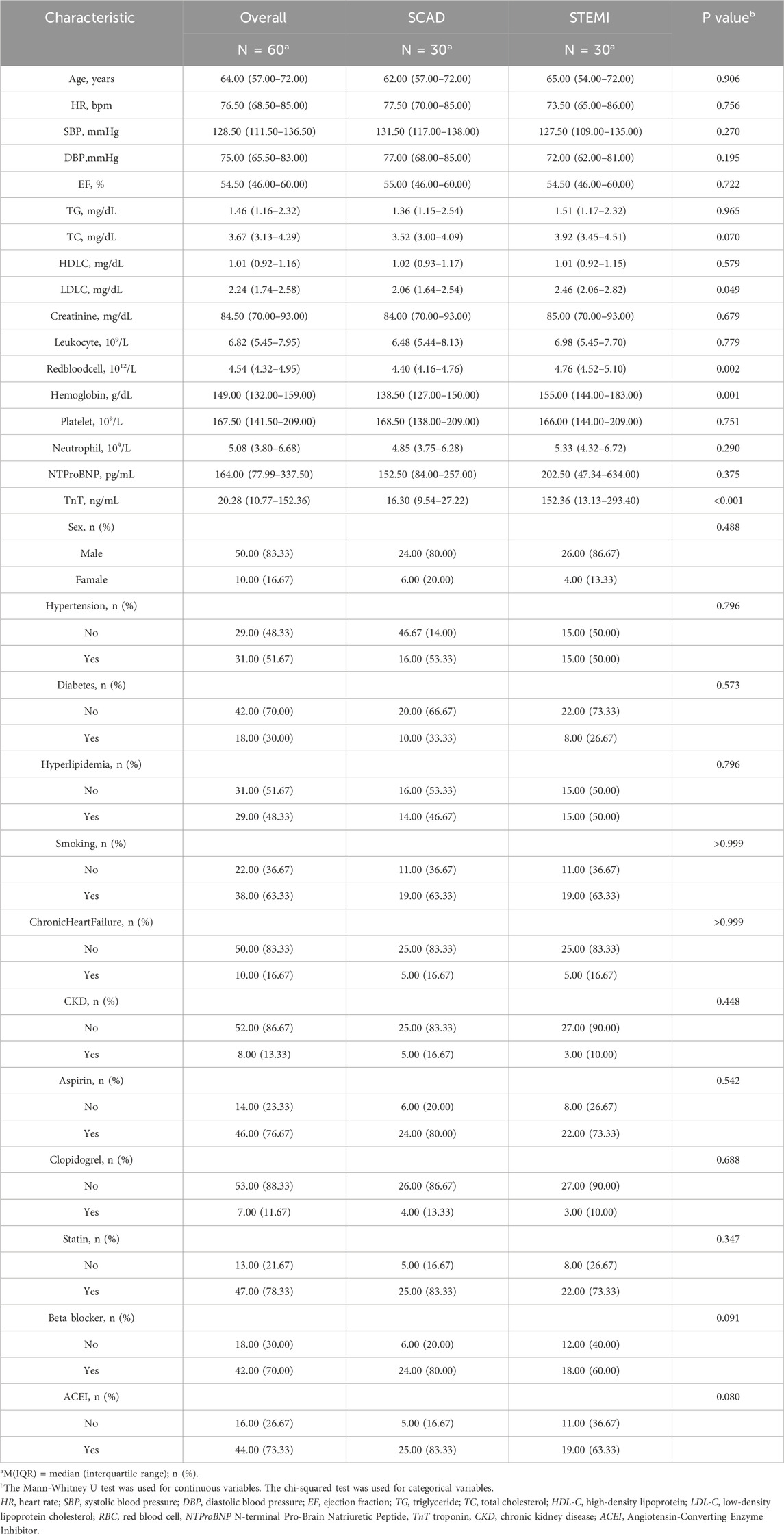 Peripheral blood samples (2 mL each) were collected from 30 consecutive STEMI patients at emergency admission prior to emergency percutaneous coronary intervention (PCI), along with 30 age- and sex-matched stable coronary artery disease (SCAD) controls (Coronary angiography revealed 50%–70% stenosis in the target coronary artery). The baseline characteristics of the patients are presented in Table 1. For lymphocyte isolation, whole blood samples were carefully layered onto Ficoll-Paque density gradient medium (LTS1077; TBD Science, China) at a 1:1 volume ratio in 50 mL conical tubes. After gentle mixing, samples were centrifuged at 2,000 × g for 20 min at room temperature. The distinct lymphocyte layer was subsequently aspirated and transferred to a fresh centrifuge tube. Cells were washed twice with phosphate-buffered saline (PBS) through sequential centrifugation (1,000 × g, 10 min, 4 °C) to remove residual plasma components. All participants provided written informed consent. The study protocol was approved by the Ethics Committee of The Affiliated Hospital of Zunyi Medical University (Approval No. KLL-2021-323) and conformed to the Declaration of Helsinki.