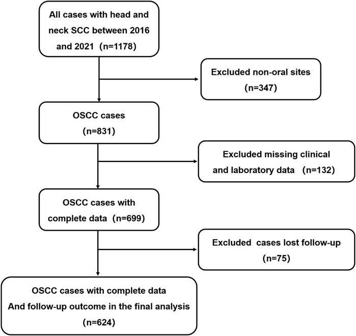Our study was conducted in full accordance with ethical principles, including the World Medical Association’s Declaration of Helsinki (2002 version), with IRB approval (CMUSH-IRB-KJ-PJ-2024-29). We performed a single-institution, retrospective cohort study. From January 2016 to December 2021, patients treated in Beijing Stomatological Hospital who satisfied the following inclusion criteria were included. The process for selecting patients for model development is presented in Figure 1. The inclusion criteria were as follows: 1) patients pathologically diagnosed as squamous cell carcinoma. 2) With a tumor located on the tongue, lower gingiva, upper gingiva, buccal mucosa, floor of the mouth, or hard palate. 3) No preoperative chemotherapy, radiotherapy or other radical treatments before the operation; Relevant routine laboratory indicators of peripheral blood should be examined within 7 days before the operation; Patients were excluded if the follow-up time was less than 1 year, and complete clinical and laboratory data were not completed.