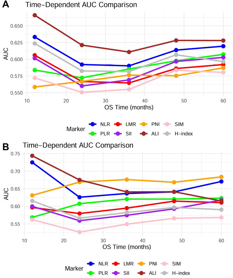 Similarly, Univariate Cox regression analysis of postoperative DFS risk factors demonstrated significant associations with sex, age, smoking and drinking history, clinical stage, and all inflammation-related markers (Supplementary Table S1). Multivariate Cox regression analysis after adjusting for confounding factors confirmed that only clinical stage served as an independent prognostic factor for DFS in OSCC patients (Supplementary Table S1). This result indicated that all inflammation-related indicators only influence the overall survival status of patients. In addition, time-dependent ROC revealed that among the eight included indicators, the ALI demonstrated the optimal predictive performance, achieving a 1-year postoperative AUC of 0.65, though no statistically significant differences were observed between the indicator groups. Notably, seven preoperative markers—NLR, LMR, SII, ALI, PLR, SIM, and H-index—exhibited a significant decline in AUC values at the 2-year postoperative interval compared to the 1-year results (Figure 3A), suggesting that these preoperative indicators may only hold predictive value for short-term prognosis after treatment.