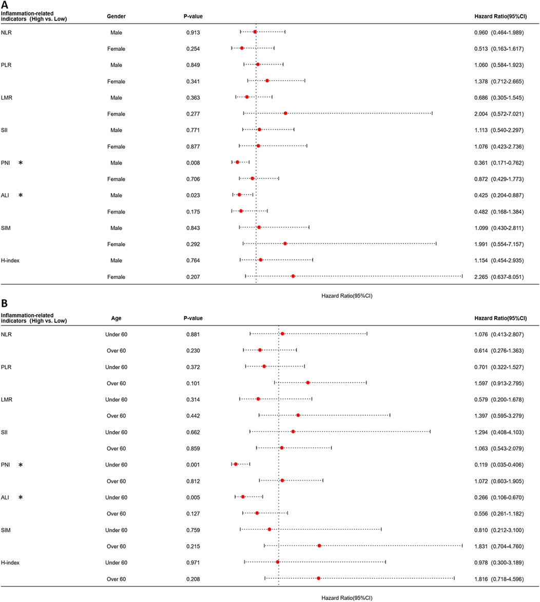 3.3 Evaluation of prognostic significance of inflammation-related indicators in age-specific and gender-specific subgroups