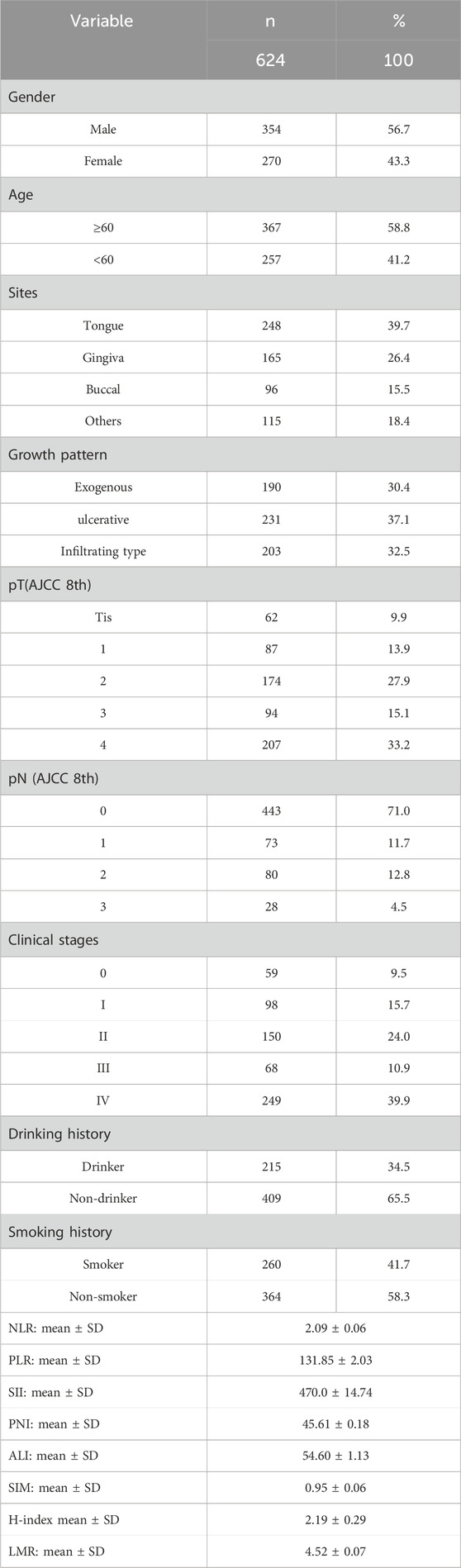 According to the inclusion criteria, we identified a total of 624 patients with OSCC who underwent primary surgery with surgically negative margins. Among these, 354 patients were men and 270 were women, 1:1.31. The most common tumor site was the tongue (39.7%), followed by the gingiva (26.4%). The proportions of smokers and drinkers were 41.7% and 34.5% respectively. From the clinical staging perspective, the cohort included 59 cases of Tis (9.5%), 98 Stage I cases (15.7%), 150 Stage II cases (24.0%), 68 Stage III cases (10.9%), and 249 Stage IV cases (39.9%), while the pathological T staging comprised 62 Tis cases (9.9%), 87 T1 cases (13.9%), 174 T2 cases (27.9%), 94 T3 cases (15.1%), and 207 T4 cases (33.2%).
