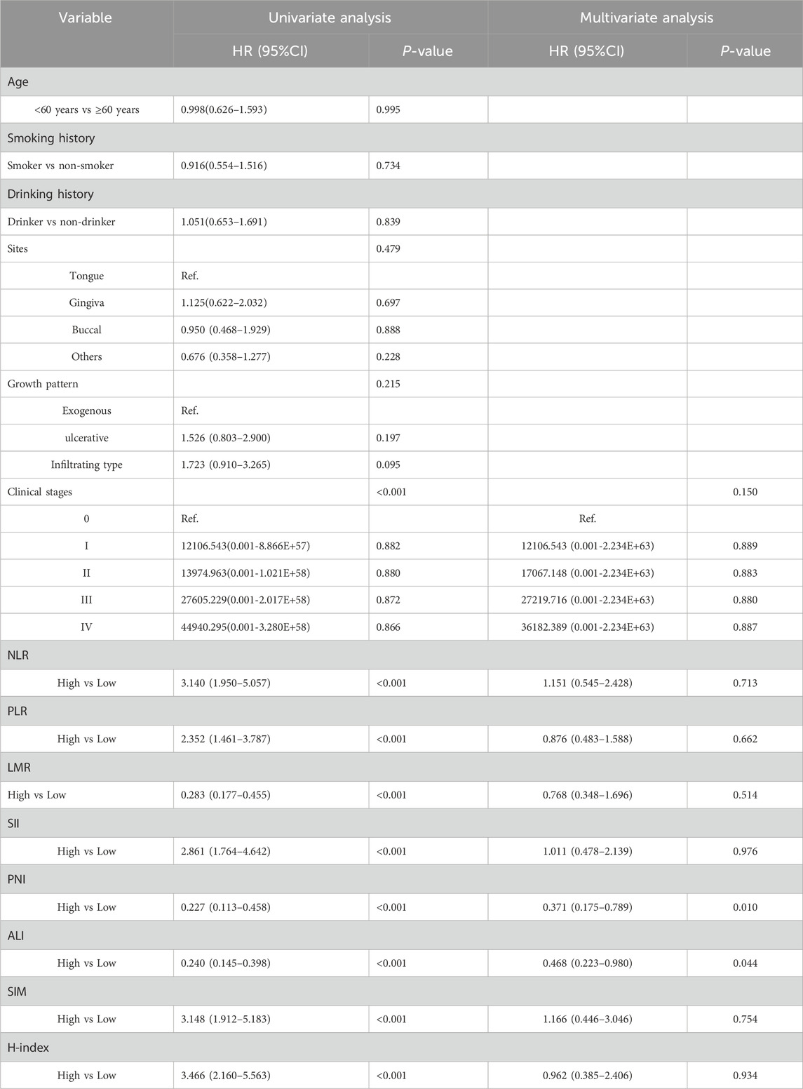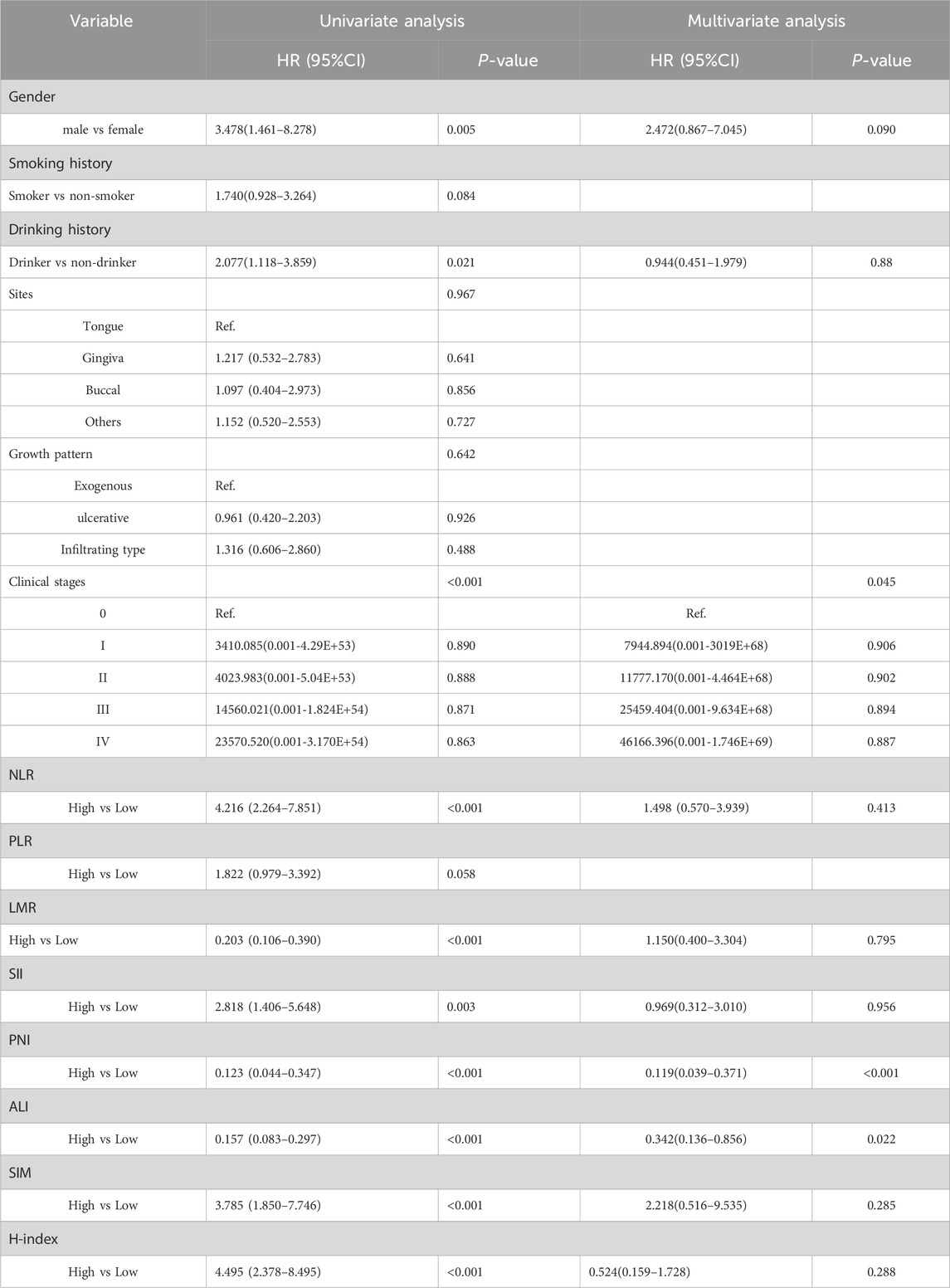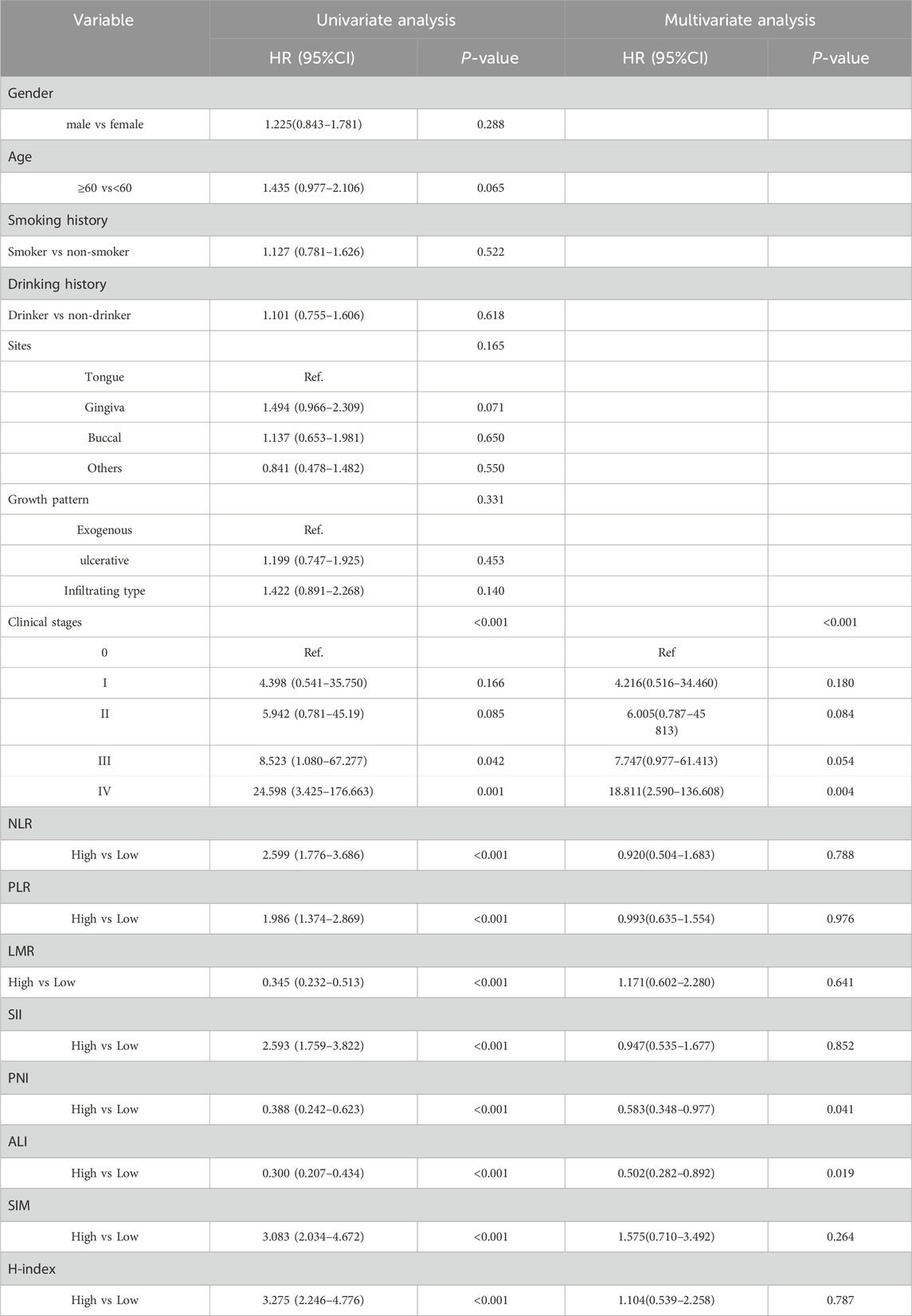 Supported by the above evidence, we further analyzed the prognostic predictive ability of each indicator item by item based on Cox univariate or multivariate analysis. Before applying the COX univariate and multivariate regression analysis, the proportional hazards of each index were verified (Supplementary Figure S1). Univariate Cox regression analysis of postoperative overall survival (OS) identified significant associations with the following variables: clinical stage (III vs 0, HR = 8.523, 95% CI: 1.080–67.277,P = 0.042), and inflammation-related indicators including NLR (high vs. low: HR = 2.599, 95% CI: 1.776-3.686, P < 0.001), PLR (high vs. low: HR = 1.986, 95% CI: 1.374-2.869, P < 0.001), LMR (high vs. low: HR = 0.345, 95% CI: 0.232-0.513, P < 0.001), SII (high vs. low: HR = 2.593, 95% CI: 1.759-3.822, P < 0.001), PNI (high vs. low: HR = 0.388, 95% CI: 0.242-0.623, P < 0.001), ALI (high vs. low: HR = 0.300, 95% CI: 0.207–0.434, P < 0.001), SIM (high vs. low: HR = 3.083, 95% CI: 2.034–4.672, P < 0.001), and H-index (high vs low: HR = 3.275, 95% CI: 2.246–4.776, P < 0.001). After adjusting for confounding factors, we performed Multivariate Cox regression analysis and confirmed that 2 inflammation-related indicators served as independent prognostic factors for OS in OSCC patients (Table 2). Specifically, elevated levels of PNI (high vs low: HR = 0.583, 95% CI: 0.348–0.977, P = 0.041), and ALI (high vs low: HR = 0.502, 95% CI: 0.282–0.892, P = 0.019) demonstrated significant correlations with OS, indicating that elevated levels of these markers may correlate with patient survival (Table 2).