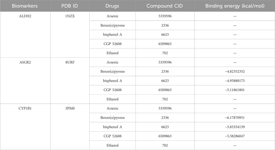 A database search identified 59 compounds related to the biomarkers. The relationship network revealed 8 compounds associated with multiple biomarkers, including arsenic (Figure 6A). Of these, protein structures for 5 compounds were available and subjected to molecular docking (Table 1). Notably, ASGR2 demonstrated a relatively strong binding affinity for CGP 52608 (Figure 6B). Additionally, ASGR2 exhibited binding capabilities with benzo(a)pyrene and bisphenol A (Figure 6B). CYP1B1 showed significant binding affinity for benzo(a)pyrene, bisphenol A, and CGP 52608 (Figure 6C), with the strongest binding energy observed for benzo(a)pyrene at −6.17870951 kcal/mol.