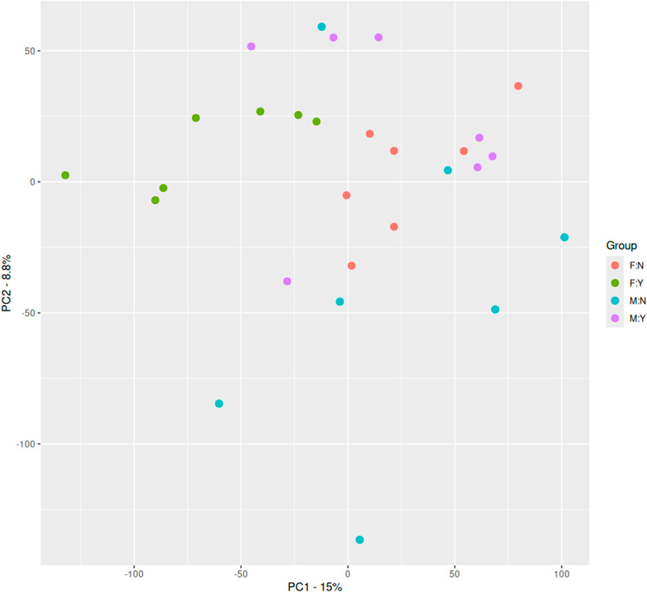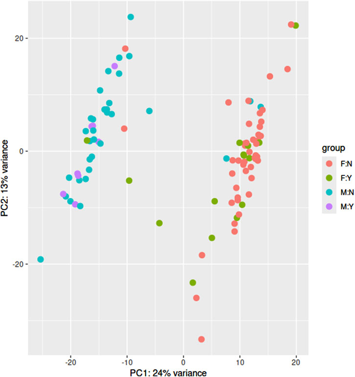 Figure 6. Principal component analysis of the RNA Seq data from the GEO dataset GSE247998. F:N = Female, healthy Control, F:Y = Female, Suicide Attempt, M:N = Male, healthy Control, M:Y = Male, Suicide Attempt.