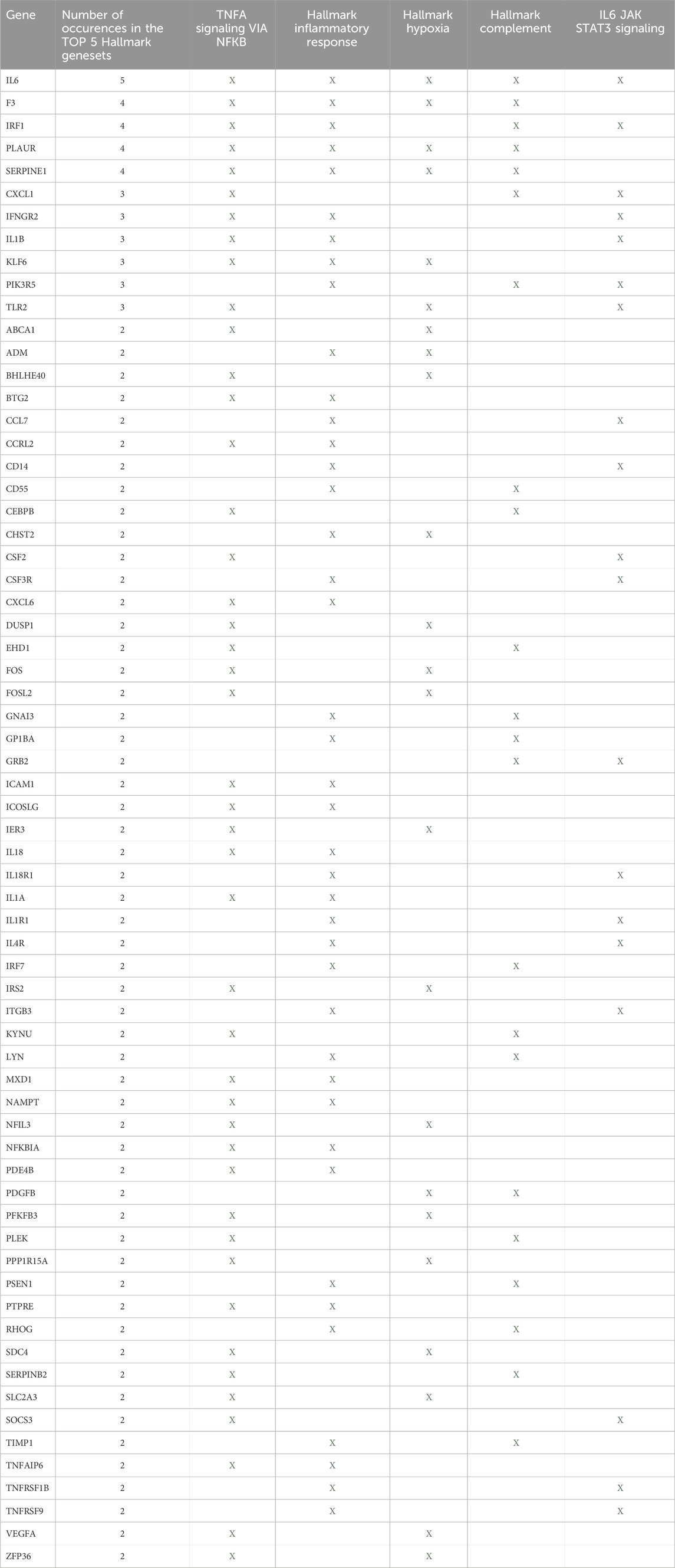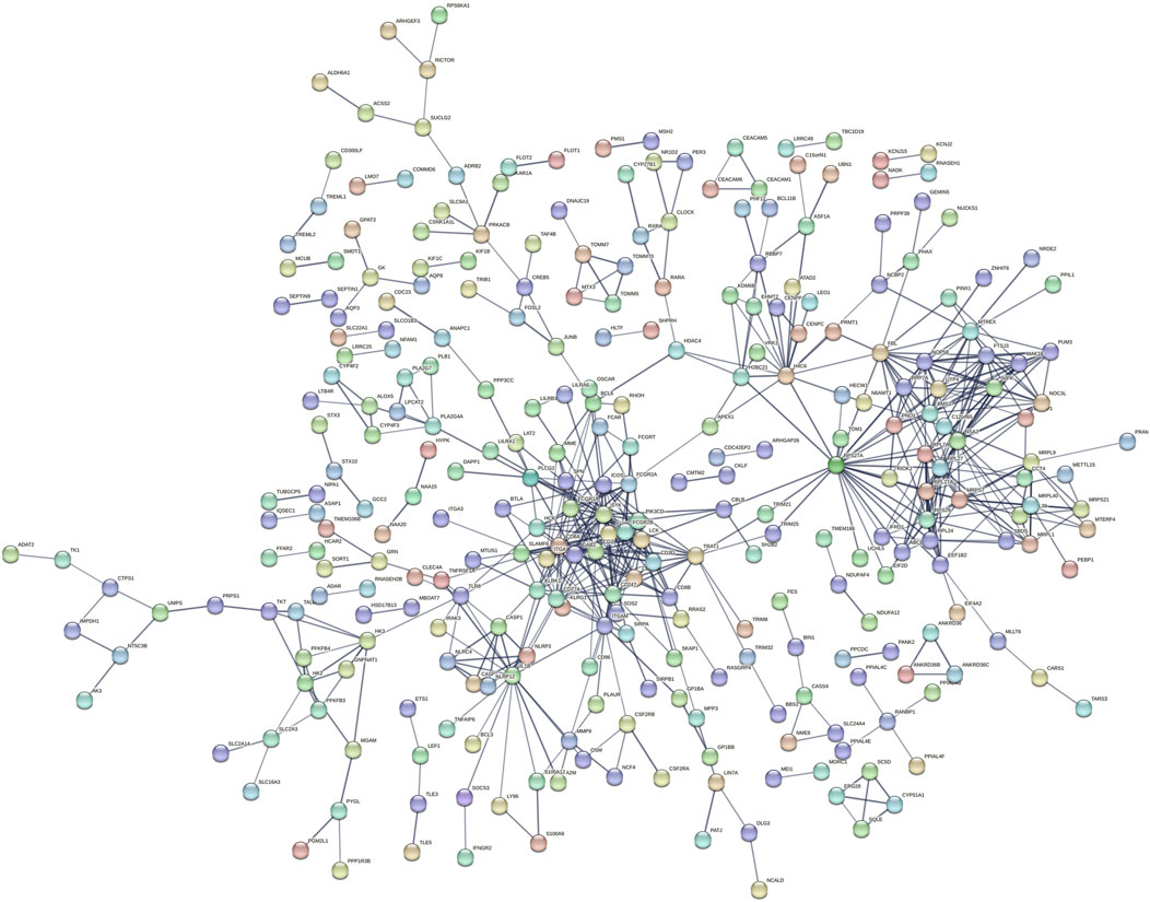 Next, we identified key regulatory genes, or “hub genes,” within the turquoise module using gene significance (GS > 0.3) and module membership (MM > 0.8) criteria (Liang et al., 2020). A total of 363 hub genes (Supplementary Table S8) were identified, which were then subjected to gene set enrichment analysis using the Hallmark collection. The results closely mirrored those from the GSEA of differentially expressed genes, with significant enrichment in TNF alpha signaling via NFKB, inflammatory response, and complement pathways (Table 4). To further investigate interactions between these hub genes, we conducted a STRING analysis. The resulting gene interaction network (Figure 5; Supplementary Figure S5) revealed two major central nodes: IL1B (inflammatory response) and GRB2 (RAS-ERK signaling pathway).