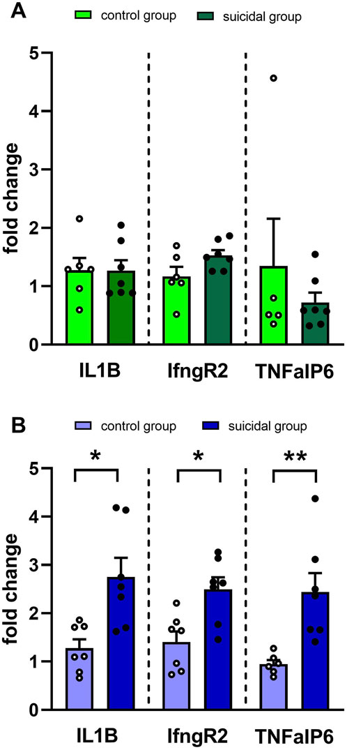 Figure 3. Validation of gene expression changes from selected differentially expressed genes in blood of male (A) and female (B) suicidal patients using qRT-PCR. Data are expressed as mean ± SEM. Gene expression changes are expressed as fold change versus the control group (Healthy individuals). Significance was determined with Student’s t-test, with *p < 0.05, **p < 0.01. IL1B = Interleukin 1-beta, IfngR2 = Interferon Gamma Receptor 2, TNFAiP6 = TNF-alpha Induced Protein 6.
