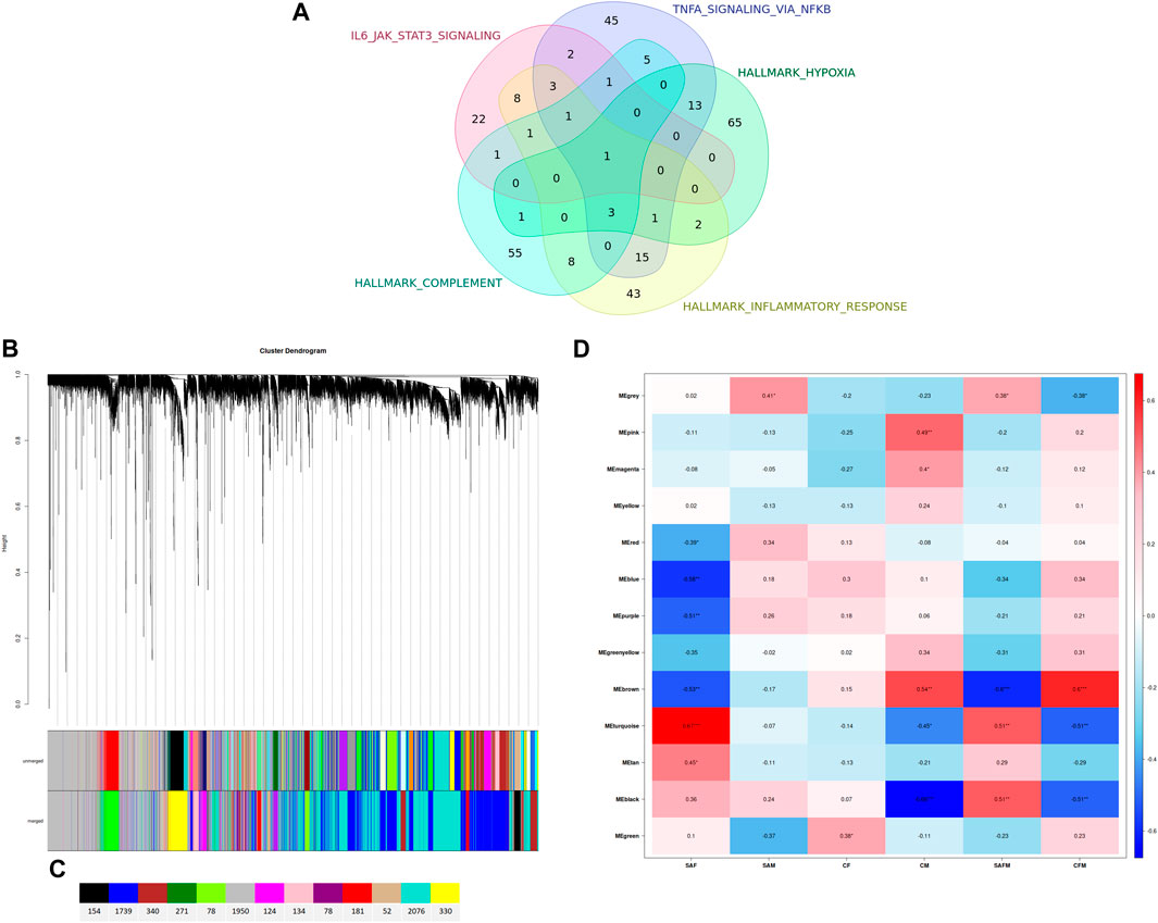 Figure 4. (A) Venn diagram illustrating the overlap of the leading-edge subset of genes (female dataset only) that are found within the top five enriched genesets of the Hallmark geneset. (B) Clustering dendrogram of all genes, with dissimilarities based on topological overlap. Each vertical line represents a single gene. Color designations assigned to the various modules within the coexpression network are shown below. (C) Number of genes assigned to the different coexpression networks. (D) Heatmap of the correlation between modules of genes and sample groups. This representation is a visual depiction of the Weighted Gene Co-expression Network Analysis (WGCNA). The heatmap reveals the correlation coefficient as well as the statistical significance of the data (*P ≤ 0.05, **P ≤ 0.01, ***P ≤ 0.001). Additionally, it indicates the direction of the correlation, whether positive (red) or negative (blue). The y-axis corresponds to the modules of genes grouped together according to their expression patterns. The x-axis denotes the sample group: SAF = Suicide Attempt, Female; SAM = Suicide Attempt, Male; CF = Healthy Control Female; CM = Healthy Control Male; SAFM = Suicide Attempt, Male and Female; CFM = Healthy Control Female and Male.