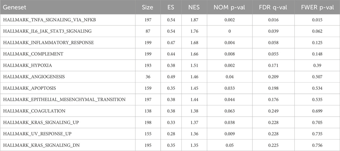 Although the WGCNA analysis by Sun et al. identified key genes subsequently analyzed via Ingenuity Pathway Analysis (IPA), their approach differs from our GSEA methodology. However, both studies converge on the same overarching biological themes, particularly the involvement of inflammatory pathways. Using the 450 genes from their significant IPA pathways for a GSEA with the Hallmark gene sets, we observed a predominant enrichment in inflammatory response pathways. As the authors did not conduct a differential gene expression analysis, we performed this analysis ourselves using the publicly available GEO dataset.