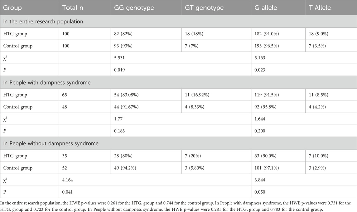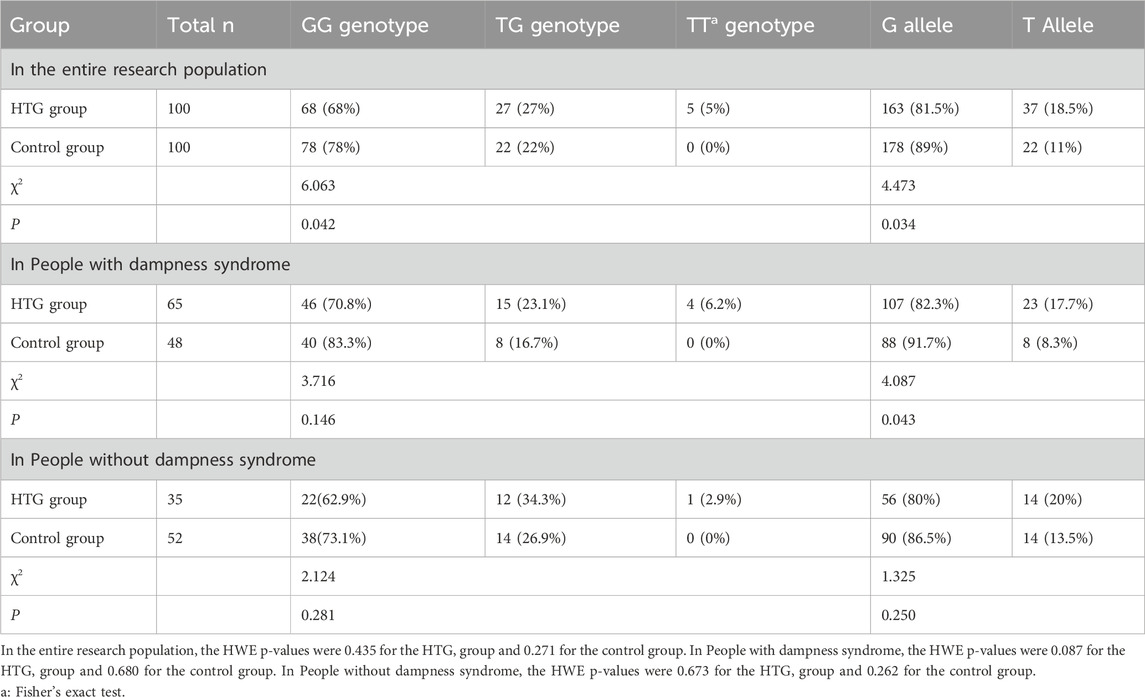 In traditional Chinese medicine, dampness syndrome stems from impaired body fluid metabolism, presenting with symptoms like fatigue, abdominal distension, and a slippery tongue coating (Zhu Wf, 2011). Epidemiological evidence indicates that populations in humid regions (e.g., Lingnan) exhibit elevated triglyceride levels, which may be associated with dampness syndrome (Chen and Huang, 2022; Zhang Bc, 2020; Zhou et al., 2024). However, the link between TCM dampness syndrome and HTG-related genetic polymorphisms remains unclear. This study investigates APOA5 rs2075291 and CIDEB rs2144492 polymorphisms in HTG patients with dampness syndrome, exploring the combined impact of genetic and TCM-specific factors on lipid metabolism.