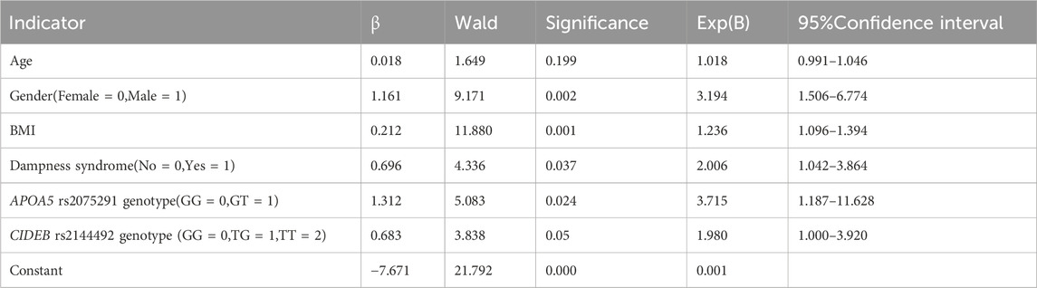 As shown in Table 5, in the overall population, HTG showed significant correlations with age, gender, body mass index, APOA5 rs2075291 genotype, and dampness syndrome (p < 0.05). In the dampness syndrome subgroup, HTG was significantly associated with gender and body mass index, whereas in the non-dampness syndrome subgroup, it was significantly correlated with gender, body mass index, and APOA5 rs2075291 genotype (p < 0.05 for all).