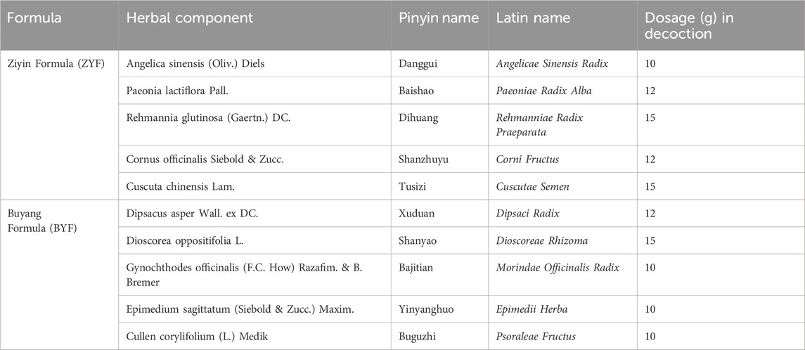 The Ziyin Buyang Formula (ZYBYF) comprises two distinct formulae: the Ziyin Formula (ZYF) and the Buyang Formula (BYF), with detailed compositions provided in Table 1. Bioactive components of ZYBYF constituents were retrieved from the Traditional Chinese Medicine Systems Pharmacology Database (TCMSP, https://ibts.hkbu.edu.hk/LSP/tcmsp.php) and supplementary literature (Li et al., 2021). Active compounds were selected based on pharmacokinetic criteria: oral bioavailability (OB) ≥30% and drug-likeness (DL) ≥0.18. Potential targets were predicted using TCMSP algorithms, with gene symbols standardized via the UniProtKB database (https://www.uniprot.org).
