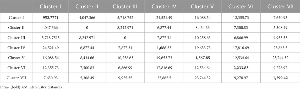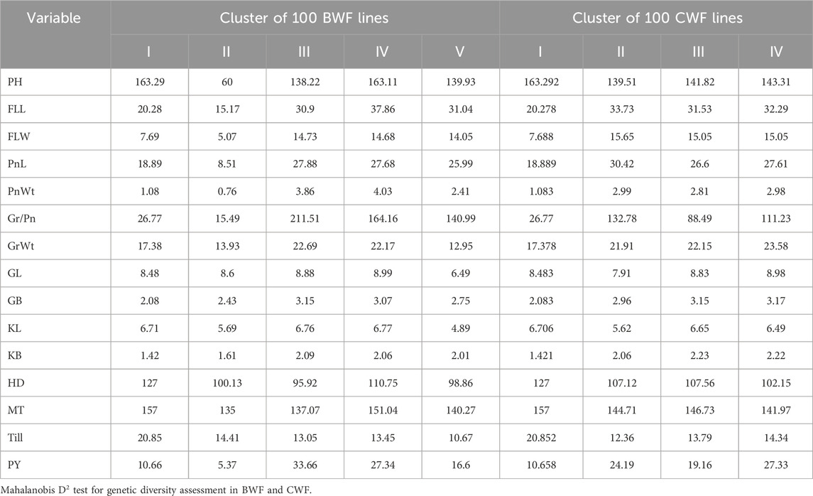 The RIL population of BWF was grouped into 5 clusters according to the mean cluster values based on 15 traits, and the CWF RIL population was grouped into four clusters, indicating the relationship among the 100 genotypes (Table 5; Figures 2H, G). Our present findings are consistent with the earlier studies of Ahmad et al. (2015) and Bordoloi et al. (2024).