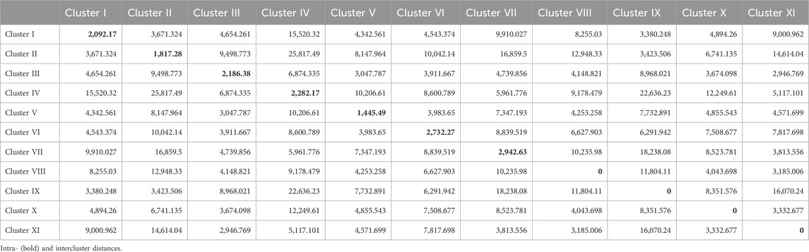 Mahalanobis D2 statistic is widely used to analyze the relative contribution of various yield components to total divergence, and it also classifies different genotypes into suitable clusters based on their genetic distances (D2 values) following Tocher’s method. Mahalanobis D2 statistic estimates the relative contribution of several components at the intra- and intercluster levels, and genotypes derived from widely divergent clusters are likely to form heterotic combinations. The 100 genotypes of BWF RIL populations were grouped into seven clusters following Tocher’s method based on Mahalanobis D2 distance values (Tables 6 and 7). Among them, five clusters are polygenotypic (i.e., I, IV, V, VI, and VII), whereas clusters II and III were monogenotypic and predicted uniqueness in the genes (Supplementary Table S3). The average intra- and intercluster D2 distance values are represented in Table 6. Intra-cluster D2 values ranged from 0.00 (clusters II and III) to 2,233.83 (cluster VI), followed by clusters IV (1,688.55), V (1,567.85), VII (1,299.42), and I (952.77). The highest intra-cluster distance (2,233.83) in cluster VI indicates wide genetic variation among the genotypes belonging to these clusters, and cluster I recorded the lowest intra-cluster distance (952.77), suggesting a closer relationship and low degree of diversity among the genotypes of this cluster. Clusters II and III consisted of only one genotype each; hence, they lacked intra-cluster distance (0.00). The largest intercluster distances were found between clusters IV and VII (25,865.50) in the BWF lines, indicating that genotypes in cluster IV were far diverse from those of VII. The least distance was observed between clusters I and II (4,047.36), which indicated that genotypes included in these cluster were closely related (Table 6). The cluster-wise mean values for the 15 characters in BWF are presented in Table 7. These are helpful to assess the superiority of the clusters during the improvement of characters through a hybridization program. The cluster mean values showed a wide range of variation for the majority of the characters undertaken in the present study. It was observed that cluster II had recorded the highest mean values for most of the traits, followed by clusters IV, VI, and VII (Table 7). The contribution of different traits to total divergence is depicted in Table 7. The trait GrPn (19.00) showed the maximum contribution toward genetic divergence, followed by GrWt (13.90), KB (13.60), GB (10.50), and PH (8.50). Out of the 15 agro-morphological traits studied, only five traits (GrPn, GrWt, KB, GB, and PH) provided the maximum contribution (65.50%) toward total divergence (Table 7). On the other hand, based on the D2 matrix, 100 CWF RILs were grouped into 11 Tocher’s clusters, of which seven were multi-genotypic and four were mono-genotypic (Supplementary Table S4). Each of the 15 traits that contributed to the overall genetic divergence in the CWF was categorized and displayed in Table 8. The contribution toward the total variation was the maximum for GrWt (24.32), followed by the other traits (Table 8). Cluster XI had the highest PY (34.95 g), with the maximum contributions from GrWt, GL, KB, PH, GB, PnL, GrPn, and PnWt. Moreover, PY benefited most from clusters VIII (32.01 g) and X (33.65 g) (Table 9). The average intra- and intercluster distances within the 11 clusters indicate the degree of divergence within and between the groups (Tables 8 and 9). The largest intercluster distances (25,817.49) were found between cluster II (CW27, CW71, CW95, CW23, CW16, CW84, CW85, and CW81) and cluster IV (CW44, CW48, CW26, and CW31), containing genotypes that were found to be the most divergent with the maximum intercluster distance. According to the D2 cluster matrix, cluster VII had the largest intra-cluster distance (2942.63) with RIL genotypes CW20 and CW34. The maximum heterosis would result from a cross between genotypes from clusters II and IV, which had the greatest genetic distance (25,817.49).