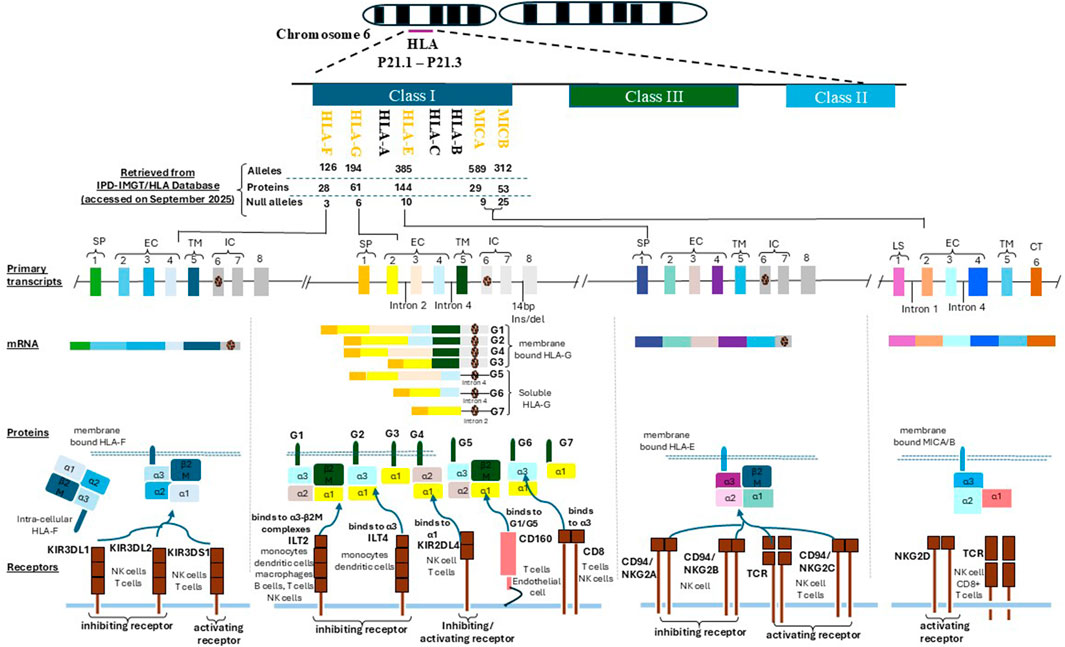 Figure 1. This figure illustrates the genomic organization and immunological functions of non-classical HLA class I genes HLA-G, HLA-F, HLA-E, MICA, and MICB located within the chromosome 6p21.1–p21.3 region. It highlights their structural domains, protein isoforms, and receptor interactions that underpin their roles in immune regulation during implantation and pregnancy. Each HLA molecule shares a conserved architecture comprising a signal peptide (SP), three extracellular domains (α1, α2, α3) responsible for ligand binding and receptor interaction, a transmembrane domain (TM) anchoring the molecule to the cell surface, and an intracellular domain (IC) involved in intracellular signaling. HLA-G, HLA-F, and HLA-E are primarily expressed as membrane-bound molecules, with HLA-G uniquely generating both membrane-bound (e.g., G1) and soluble isoforms (e.g., G5) through alternative splicing. MICA and MICB are induced under cellular stress conditions (e.g., infection, oxidative stress, or malignant transformation) and are typically expressed on the cell surface of epithelial and endothelial cells. Receptor interactions are pivotal to their immunomodulatory functions. HLA-G engages ILT2 (LILRB1) and ILT4 (LILRB2) via its α3 domain and interacts with KIR2DL4 through its α1 domain, leading to inhibition of NK and T cell cytotoxicity. Soluble isoforms of HLA-G also bind CD160, influencing T cell and endothelial cell responses. HLA-E binds both the inhibitory receptor CD94/NKG2A and the activating receptor CD94/NKG2C, modulating NK and CD8+ T cell activity in a peptide-dependent manner. HLA-F, which may function in both open conformer and peptide-bound states, interacts with KIR3DL2 (inhibitory) and KIR3DS1 (activating) receptors on NK and T cells. MICA and MICB act as ligands for the activating receptor NKG2D, expressed on NK cells, CD8+ αβ T cells, and γδ T cells. This interaction promotes cytotoxic immune responses, contributing to immune surveillance and implantation-related inflammation. These molecular interactions support the establishment of maternal–fetal immune tolerance, regulate decidual NK cell activity, and influence reproductive outcomes in both natural and assisted conception.