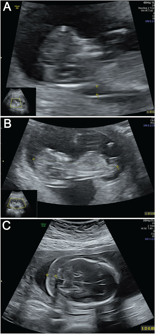Figure 1. Ultrasound images of fetus demonstrating key anatomical views. (A) Ultrasound measurement of NT thickness. Yellow calipers mark the NT measurement points; (B) Fetal CRL measurement by ultrasound. The dotted line between yellow calipers indicates the CRL. (C) Ultrasound evaluation of NF thickness. Yellow calipers demarcate the NF measurement area.