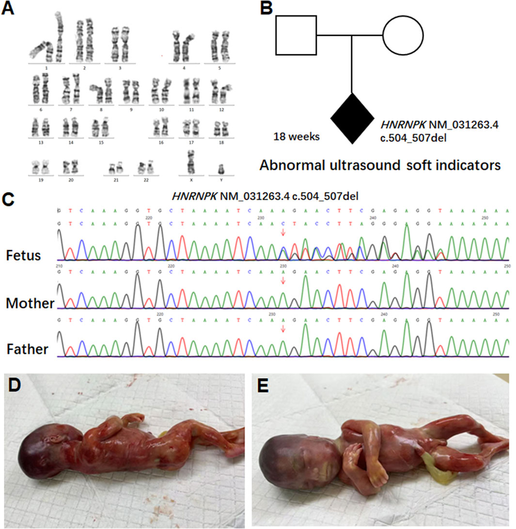 Figure 2. Pedigree analysis and genetic findings of the HNRNPK variant. (A) G-banded karyotype analysis of amniotic fluid cells from the 18-week fetus. Conventional G-banded karyotype analysis of amniotic fluid cells revealed a normal 46, XY karyotype. (B) Pedigree analysis of a family carrying an HNRNPK variant. The proband (shaded diamond, 18-week fetus) carries a heterozygous HNRNPK deletion (NM_031263.4:c.504_507del) in exon nine of 17. Parental symbols show no variant carriage. (C) Sanger sequencing validation of the HNRNPK variant. Chromatograms compare the proband (fetus) with parents at the variant site (arrow). The heterozygous 4-bp deletion appears de novo in the fetus, as both parents show wild-type sequences at this locus. (D–E) show the appearance of the 18-week-old fetus.