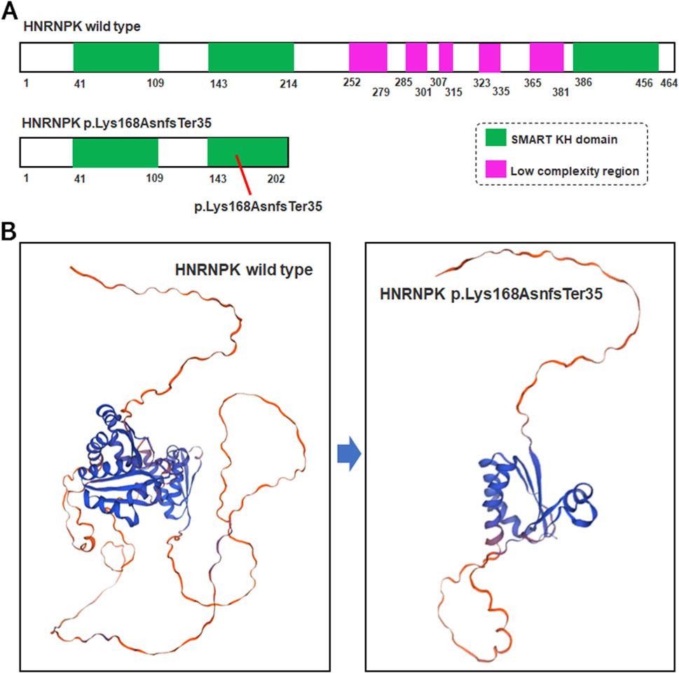 Figure 3. Structural comparison of wild-type and mutant HNRNPK protein. (A) Schematic of HNRNPK protein structure. Upper panel: Wild-type HNRNPK (464 aa) with intact SMART KH domains (green) and C-terminal low-complexity regions (purple). Lower panel: Hypothetical p.Lys168AsnfsTer35 mutant (exon nine of 17). (B) Predicted 3D structures of HNRNPK. Left panel: Wild-type with canonical fold of functional regions. Right panel: Hypothetical mutant structure-truncation at aa 202 is predicted to disrupt the SMART KH domain and lose the low-complexity region, based on the assumption of mRNA escaping NMD.