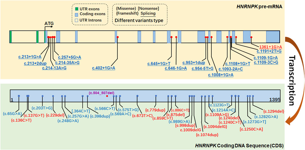 Diagram of HNRNPK gene variants in pre-mRNA and coding DNA sequence (CDS). Upper section shows UTR exons, coding exons, and introns with specified variants, indicated by red markers for splicing, nonsense, frameshift, and missense mutations. Lower section displays coding exons with additional variants. Labels show specific nucleotide changes, categorized by mutation type. Transcription is indicated between sections.