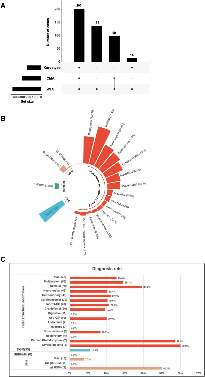 Panel A shows a bar chart with the number of cases using karyotype, CMA, and WES, with the largest mutation set size represented by karyotype. Panel B is a circular bar chart illustrating fetal structural anomalies, including multisystem, skeletal, neurological issues, percentages labeled. Panel C presents a horizontal bar chart comparing the diagnosis rates of different fetal structural anomalies, such as multisystem and skeletal, each with a percentage.