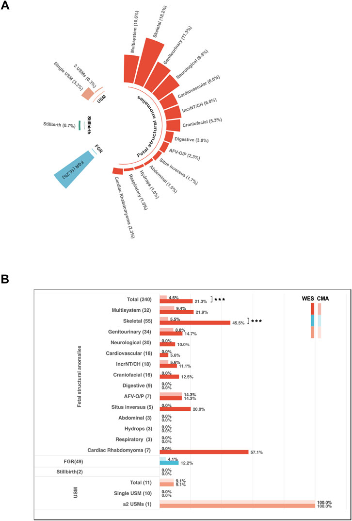 Panel A shows a circular bar chart visualizing the proportion of different fetal structural anomalies. Categories include skeletal, multisystem, genitourinary, and others, with percentages provided for each. Panel B presents a horizontal bar chart comparing the detection rates of anomalies using Whole Exome Sequencing (WES) and Chromosomal Microarray Analysis (CMA). Detection percentages for categories like skeletal, multisystem, and genitourinary anomalies are shown, highlighting higher detection rates for WES in several categories.