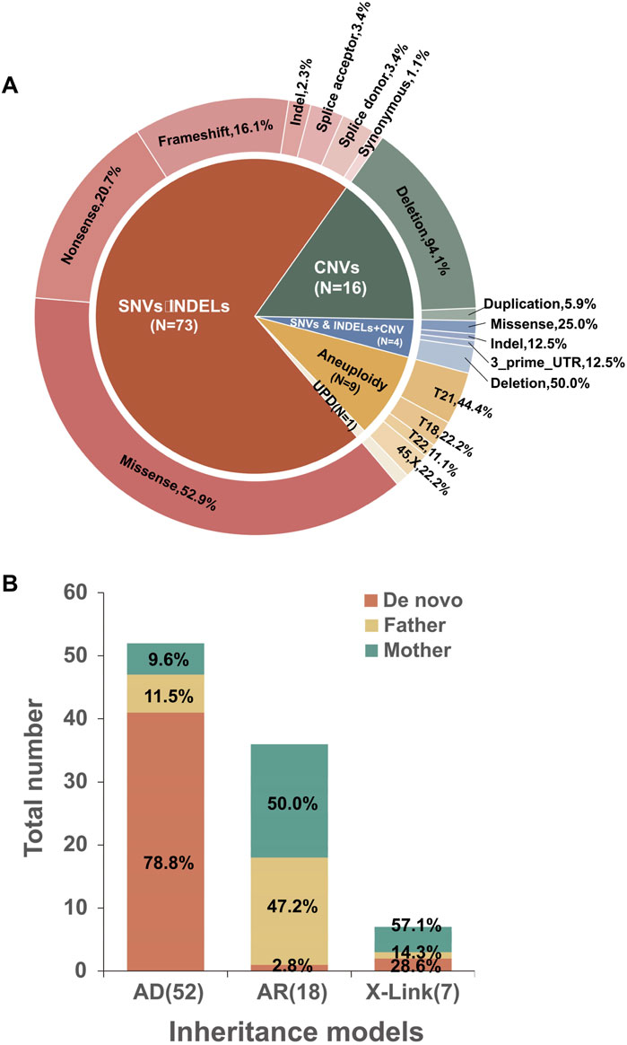Figure 3. Characterization of molecular variants. (A) Distribution of variant types among the 103 cases with positive findings. (B) Inheritance models were identified in cases with diagnostic sequence variants, along with the proportion of de novo and inherited variants.