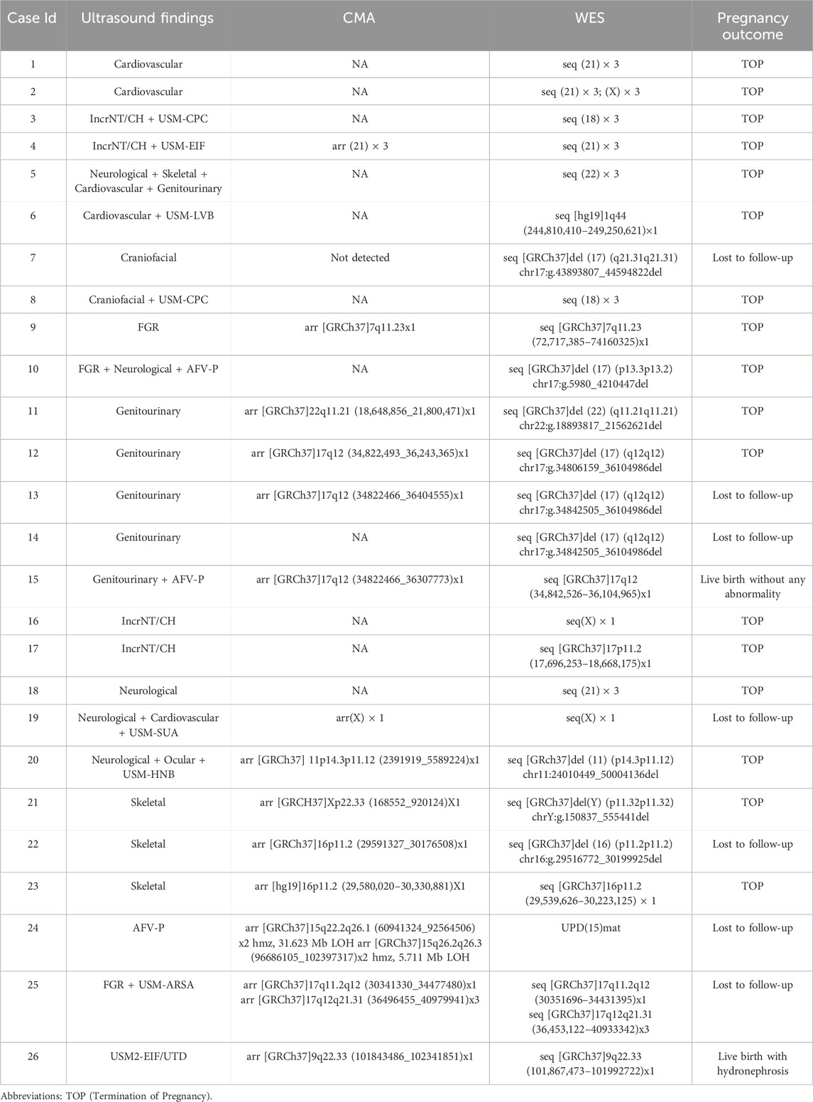Table 1. Summary of Aneuploidies and Pathogenic or Likely Pathogenic Copy Number Variants (CNVs) Identified by Trio-based Whole Exome Sequencing (trio-WES) with or without Chromosomal Microarray Analysis (CMA) and/or karyotyping.
