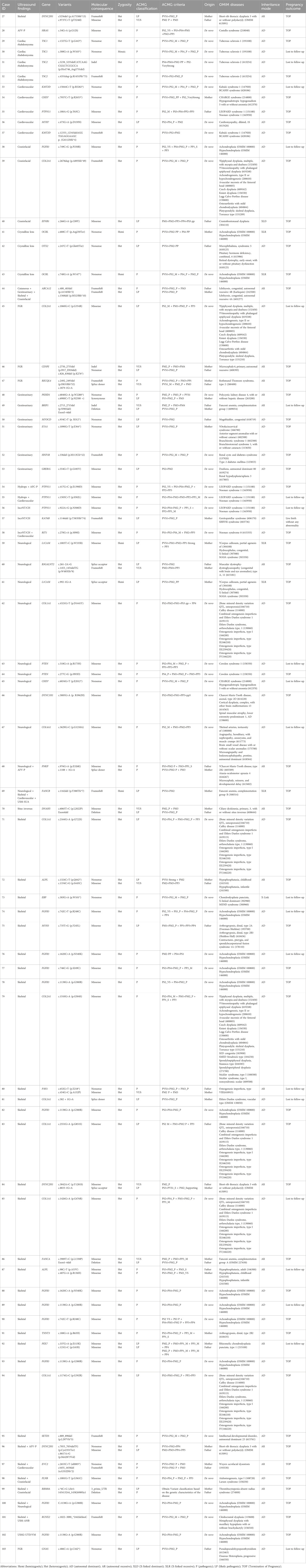 The diagnostic sequence variants identified by WES were detailed in Table 2. The interpretation of the variants integrated clinical phenotypes and inheritance models to facilitate the assessment of fetal ultrasound results. These variants were interpreted based on the guidelines of the American College of Medical Genetics and Genomics (ACMG) and classified as pathogenic (P) or likely pathogenic (LP). Notably, 10 variants of uncertain significance (VUS), which were clinically relevant, were detected in trans with a P/LP variant in 10 cases associated with autosomal recessive disorders. Herein, all P/LP variants, as well as clinically relevant VUS, summarized in Table 2, were referred to as causal variants.