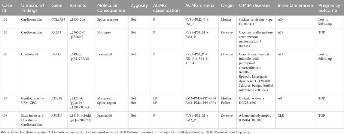 The rapid advancement of next-generation sequencing (NGS) technologies has revolutionized genetic diagnostics for fetal abnormalities detected by prenatal ultrasound (Dixon et al., 2011; Emms et al., 2022; Moresco et al., 2022; Zhou et al., 2023). WES, which targets the protein-coding regions of the genome, offers a more comprehensive approach to identifying single-nucleotide variations (SNVs) as well as insertions and deletions (indels) associated with genetic disorders. This method has proven effective in elucidating the genetic causes of fetal anomalies detected by ultrasound, providing valuable insights into genotype-phenotype correlations (Hopkins et al., 2020; Monaghan et al., 2020). Despite its potential, the clinical application of this sequencing technique in prenatal diagnostics remains underexplored. The ongoing accumulation of phenotype and genotype data is crucial for enhancing the accuracy of genetic interpretations, advancing our understanding of the molecular mechanisms underlying fetal structural anomalies, and enabling more precise genetic counseling.