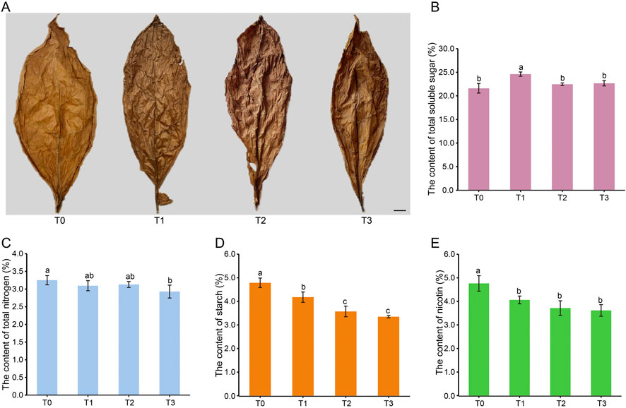 Five-panel image. Panel A shows four tobacco leaves labeled T0 to T3, demonstrating different treatments. Panel B is a bar graph showing total soluble sugar content, with T1 slightly higher. Panel C depicts total nitrogen content, similar across treatments with slight variation. Panel D presents starch content, highest in T0, decreasing in T1 to T3. Panel E shows nicotine content, highest in T0, lower in T1 to T3. Different letters indicate statistical differences.