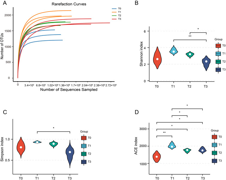 Panel A shows rarefaction curves for four groups (T0, T1, T2, T3) with the number of OTUs increasing with sequences sampled. Panel B presents a violin plot of the Shannon index showing differences among groups. Panel C provides a violin plot of the Simpson index with significant differences between T0 and T1. Panel D displays a violin plot of the ACE index, highlighting significant differences across all groups. Statistical significance is denoted with asterisks. Each panel uses distinct colors to represent the groups.