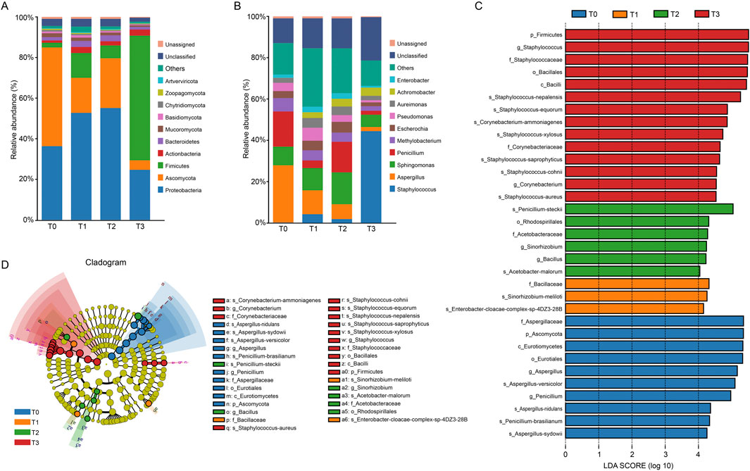 Bar charts A and B depict relative abundances of various microbial groups at different time points (T0, T1, T2, T3). Chart C shows LDA scores for microbial taxa across these time points, highlighting taxonomic changes. The cladogram D visualizes phylogenetic relationships among significant taxa, color-coded by time points.