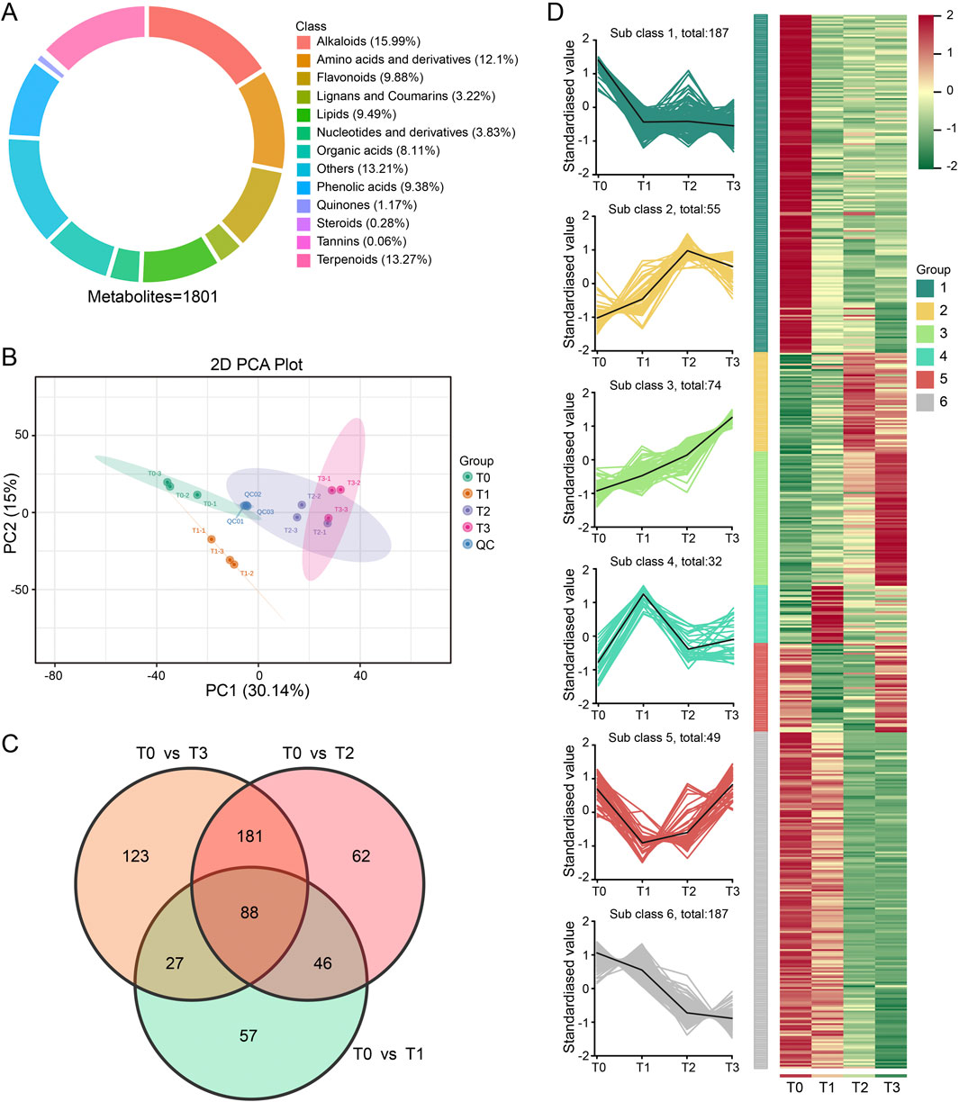 A composite image contains multiple data visualizations related to metabolite analysis. Panel A shows a circular chart with metabolite classes and their percentages, highlighting alkaloids, amino acids, and terpenoids as major classes. Panel B presents a 2D PCA plot displaying group separation among four time points (T0, T1, T2, T3) and quality control. Panel C is a Venn diagram illustrating shared and unique metabolites across three comparisons. Panel D includes six line graphs with standardized values for subclasses over time and a heatmap showing expression patterns, grouped by six categories.