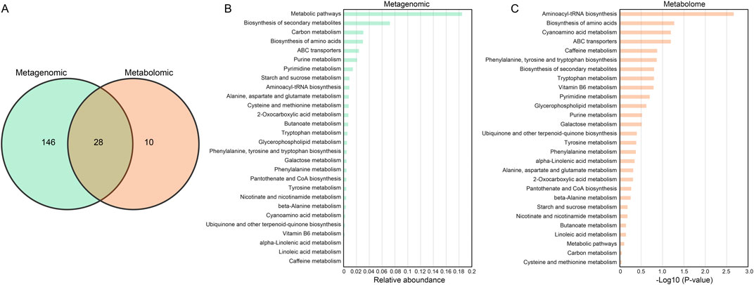 Figure 5. Integrated analysis of pathways enriched by microorganisms and differential metabolites. (A) Venn diagram illustrating the overlapping and specific metabolic pathway of microorganisms and metabolites. Relative abundance map of 28 overlapping KEGG pathways in (B) metagenome and (C) metabolome.