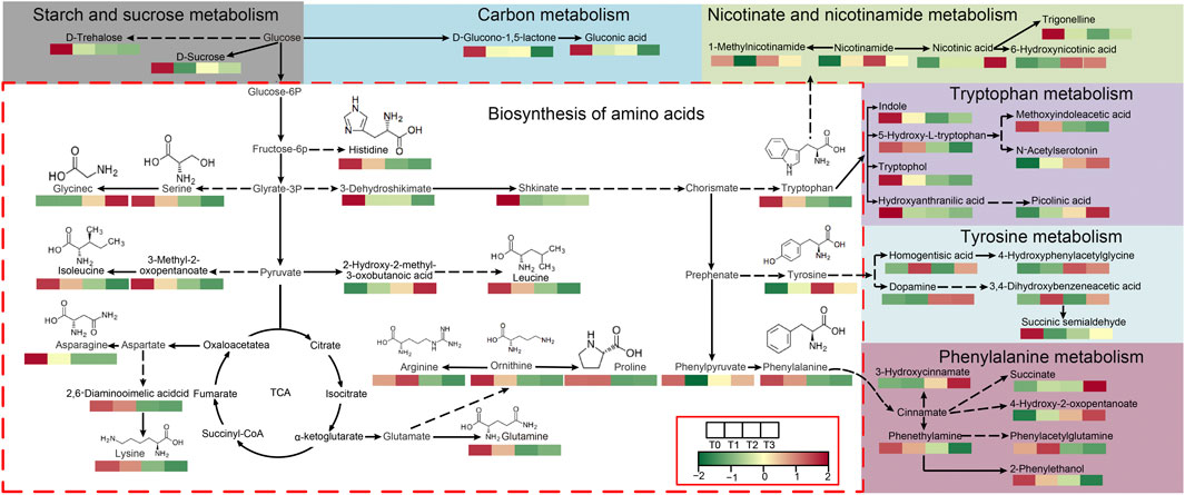 Diagram illustrating the metabolic pathways and biosynthesis of amino acids, including starch and sucrose metabolism, carbon metabolism, and nicotinate and nicotinamide metabolism. Various metabolites and routes are depicted, with heatmap bars showing relative expression levels across time points T0 to T3. Pathways for tryptophan, tyrosine, and phenylalanine metabolism are detailed, with associated compounds like ornithine, arginine, and glutamine. A color scale indicates data values ranging from negative two to positive two.