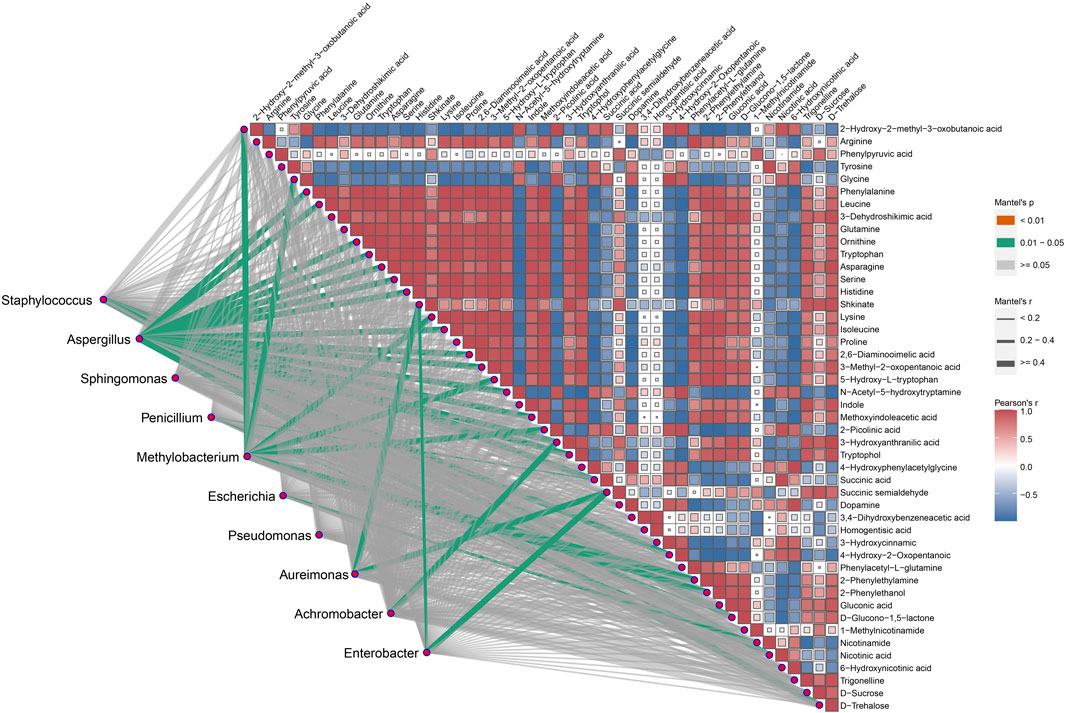 Intra-group correlation analysis was performed within the 47 differential metabolites associated with the 7 metabolic pathways, and further inter-group correlation analysis was performed between these 47 differential metabolites and the top 10 microorganisms (Figure 7). In the intra-group correlation, significant correlations were found among the majority metabolites except four metabolites, namely, 3, 4-dihydroxybenzeneacetic acid, homogentisic acid, 1-Methylnicotinamide, and phenylpyruvic acid. Inter-group analysis showed that 8 dominant microbial genera, namely, Staphylococcus, Aspergillus, Penicillium, Methylobacterium, Escherichia, Aureimonas, Achromobacter and Enterobacter, were significantly associated with 29 metabolites. This result implies that these bacteria genera may serve as the functional bacteria involved in the metabolism of these metabolites.