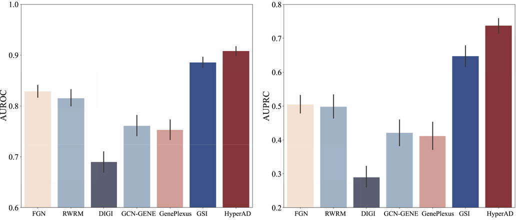 To demonstrate the superiority of HyperAD, we conduct a comprehensive benchmark against six state-of-the-art methods for disease gene prediction: FGN, RWRM, DiGI, GCN-GENE, GSI, and GenePlexus. FGN (Yao et al., 2018) first constructs a tissue-specific functional gene network by integrating various evidence sources, such as coexpression and protein-protein interactions, within a Bayesian framework; this network is then used to train an SVM classifier. c DiGI, a node kernel-based approach, generates powerful gene features by applying a graph kernel to multiple heterogeneous networks and then integrates these features to train an SVM for prediction (Tran et al., 2020). GCN-GENE (Zhang et al., 2022) represents a deep learning approach, utilizing a Graph Convolutional Network to learn node embeddings by convolving over a biological network structure while using gene expression data as initial node features. GSI (Li et al., 2022) first constructs a gene signal matrix where each row is a gene and each column represents a biological signal derived from gene-set membership, which is then fed into a machine learning model; for our experiments, we use its high-performing Random Forest-based implementation. Lastly, GenePlexus (Mancuso et al., 2022) employs a semi-supervised learning strategy on a large-scale human gene interaction network, propagating labels from known disease genes to predict novel associations. For a fair and robust evaluation, all methods are trained and tested on identical positive and negative gene sets under a rigorous ten-repetition, five-fold cross-validation scheme. We evaluate performance using the Area Under the Receiver Operating Characteristic Curve (AUROC) and the Area Under the Precision-Recall Curve (AUPRC), reporting the mean and standard deviation across all 50 folds to ensure a reliable comparison.