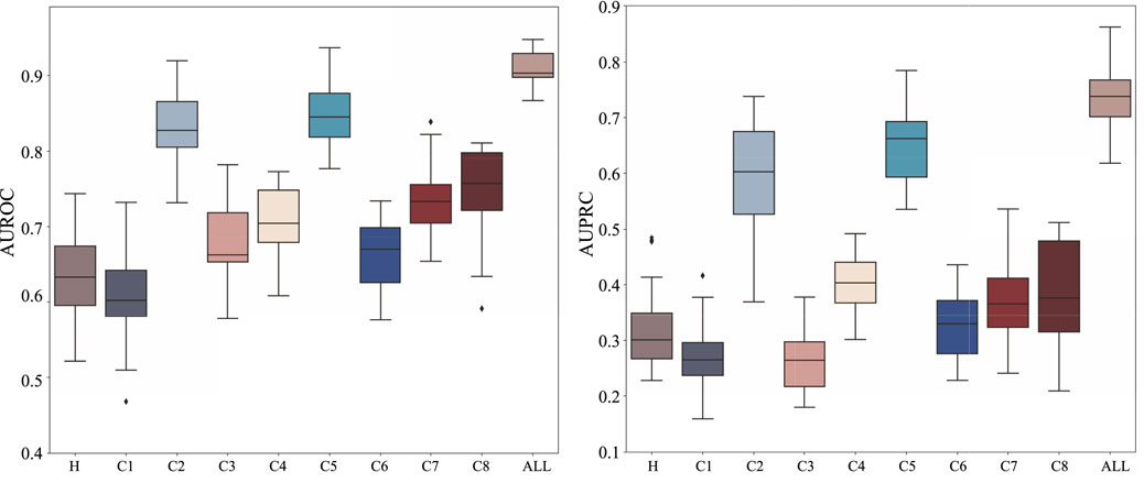 Two box plots compare AUROC and AUPRC values across different categories: H, C1, C2, C3, C4, C5, C6, C7, C8, and ALL. The left plot shows AUROC scores ranging from 0.4 to 0.9, with noticeable variability among categories. The right plot presents AUPRC scores, also displaying significant variability. Both plots show outliers with markers beyond the whiskers.