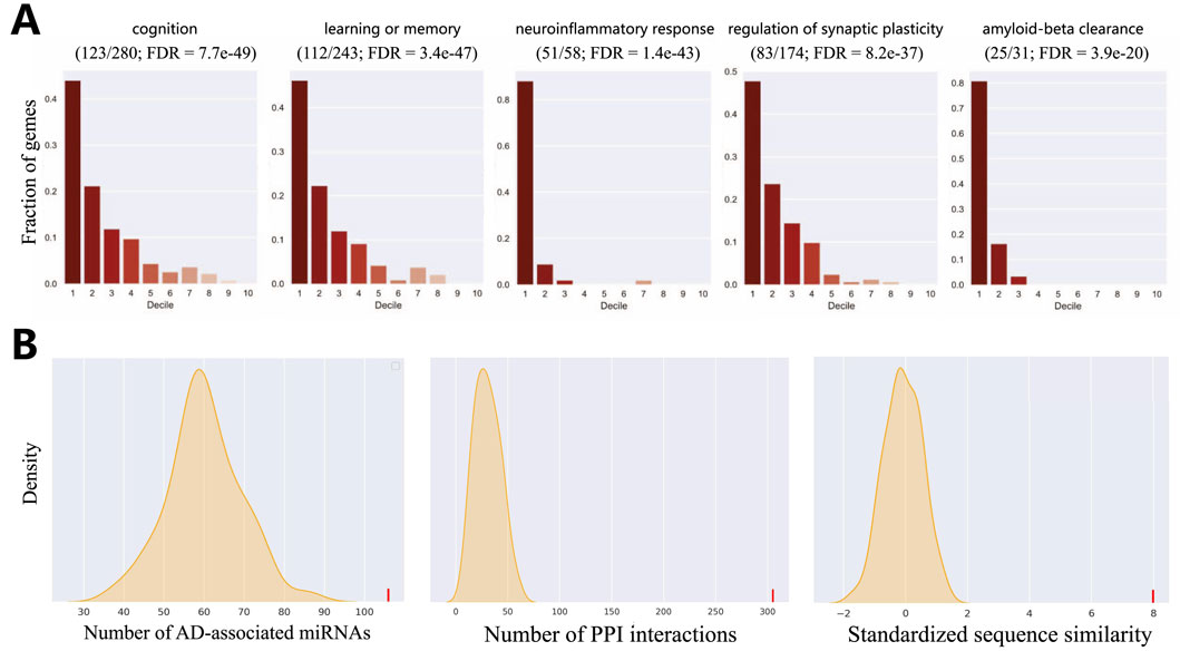 Panel A shows bar graphs depicting fractions of genes across deciles for cognition, learning or memory, neuroinflammatory response, regulation of synaptic plasticity, and amyloid-beta clearance, with significant FDR values indicated. Panel B displays three density plots for the number of Alzheimer's disease-associated miRNAs, number of protein-protein interactions, and standardized sequence similarity.