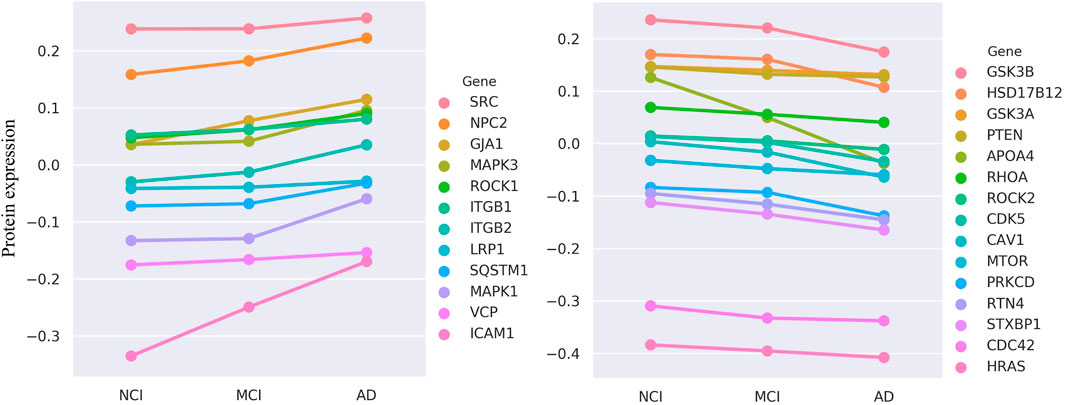 Line graph comparing protein expression levels of various genes across three conditions: NCI, MCI, and AD. The left panel shows genes such as SRC and NPC2, with diverse expression trends. The right panel features genes like GSK3B and MTOR, also displaying varying patterns. Each gene is colored differently, with a legend on the right indicating the corresponding color for each gene.