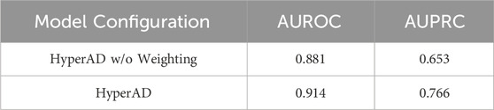Furthermore, we conduct a second ablation study to specifically evaluate the contribution of our core AD-specific weighting module. In this experiment, we remove this module from the architecture, thereby treating all biological information with equal importance without disease-specific prioritization. As detailed in Table 2, the full HyperAD model demonstrates a significant performance gain compared to the ablated version, with an increase of 3.3% in AUROC and 12.3% in AUPRC. This result strongly highlights the critical role of the AD-specific weighting module in focusing the model on the most disease-relevant biological contexts, which substantially enhances its predictive accuracy.