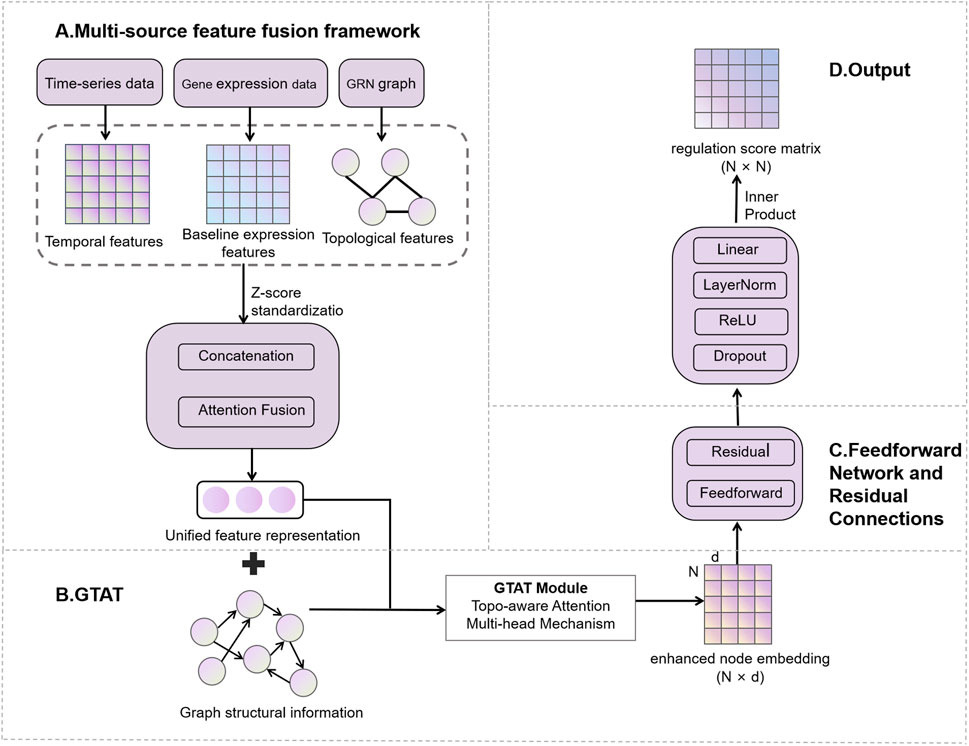 The proposed GTAT-GRN method is a novel GRN inference approach based on GTAT (Shen et al., 2025). The architecture of GTAT-GRN is shown in Figure 1, consisting of four modules: (A) multi-source feature fusion framework, (B) Graph Topology Attention Network (GTAT), (C) feedforward network and residual connections, and (D) GRN prediction output layer.