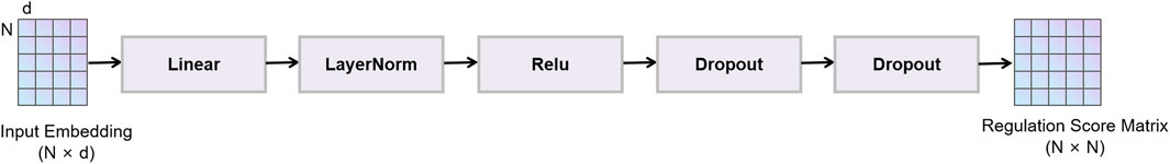 In this model, the output layer (Figure 4) maps node representations processed by graph convolution, feature fusion, and the feedforward network to regulatory probability scores between genes. This layer first reduces the dimensionality of fused node features via a linear transformation, then applies layer normalization, ReLU activation and Dropout regularization in sequence to enhance the model’s expressiveness and generalization (Reddy et al., 2024). During training we use Focal Loss as the objective function to mitigate class imbalance and improve the model’s ability to detect rare regulatory interactions. The raw output is a real-valued score, where values above zero indicate a predicted regulatory interaction and values at or below zero indicate no interaction. The magnitude of this score reflects the model’s confidence. During inference the raw score is passed through a Sigmoid function to map it into the [0, 1] interval and yield a probability for regulatory interaction.