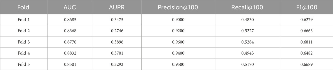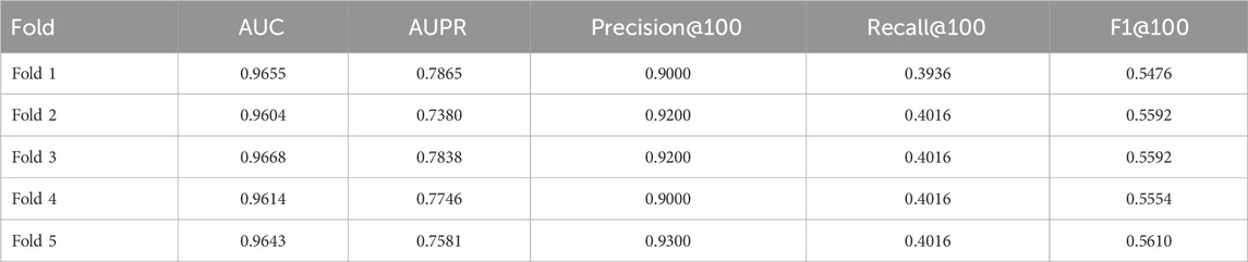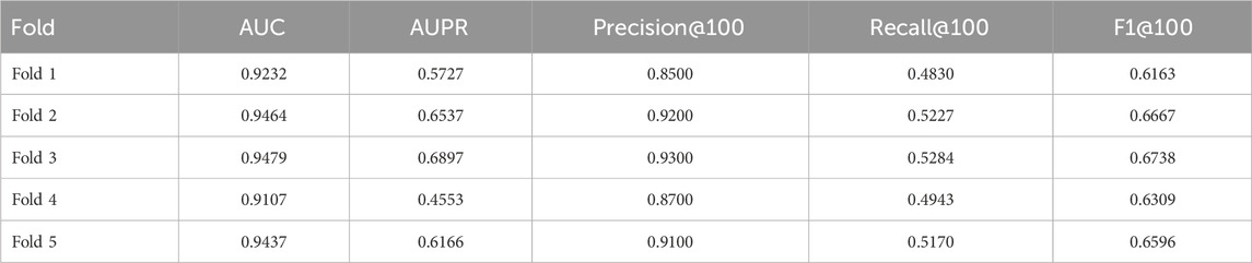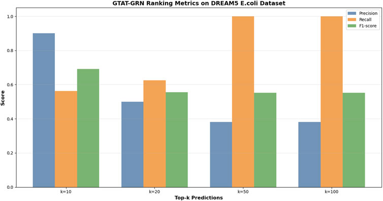 Figure 6 presents the experimental results of GTAT-GRN on the DREAM5 E. coli dataset, demonstrating its strong performance in gene regulatory network inference. The model achieved an AUC of 0.7596 and an AUPR of 0.6075, indicating robust overall performance. Notably, for high-confidence predictions, Precision@10 reached 0.9000 and F1@10 was 0.6923, suggesting that the model can accurately identify the most reliable regulatory relationships. Meanwhile, the Recall value demonstrates the model’s excellent coverage ability. These results verified the validity and practicability of GTAT-GRN on real biological data. These results confirm the validity and practical applicability of GTAT-GRN on real biological data.