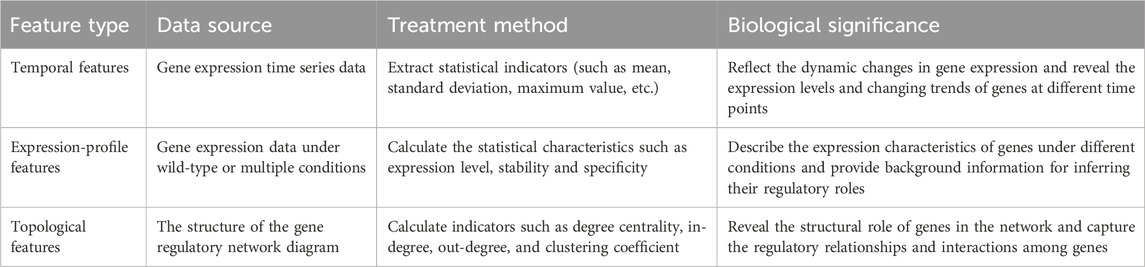 To improve GRN inference, we design a multi-source feature-fusion module (Wu et al., 2023) that jointly models three information streams: temporal dynamics of gene expression (Rubiolo et al., 2015), baseline expression patterns (Yuan and Bar-Joseph, 2021), and network topology (Liu et al., 2023). The types, sources, treatment methods and biological functions of the features are detailed in Table 1.