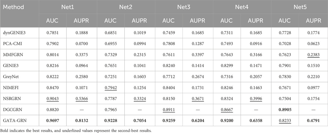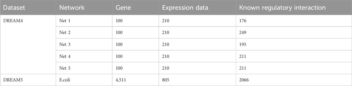 To evaluate the effectiveness of the proposed GTAT-GRN method for GRN inference, we employed both simulated benchmark datasets and real biological expression data. The simulated dataset is DREAM4 InSilico_Size100 (Marbach et al., 2010), generated by the GeneNetWeaver (GNW) tool (Schaffter et al., 2011), which accurately simulates transcriptional regulatory mechanisms and provides a known gold standard network. This dataset is widely recognized as a standard benchmark in GRN inference research (Marbach et al., 2012). It contains five independent sub-networks of 100 genes each, covering diverse experimental conditions such as time-series perturbations and homeostasis interventions (Marbach et al., 2009). The time-series data include 21 equally spaced sampling points with intervals of 50 time units. For feature extraction, we used a sliding window with size 3 and step size 1. The real dataset is DREAM5 Escherichia coli (Escherichia coli) expression data (Lim et al., 2013), derived from experiments that include time-series measurements and gene knockouts. It also provides an official gold standard network, enabling performance evaluation under real biological conditions. This dataset contains 4,511 genes, of which 1,371 exhibit time-series characteristics. We selected these genes for experiments and applied a sliding window with size 5 and step size 1 during feature extraction.