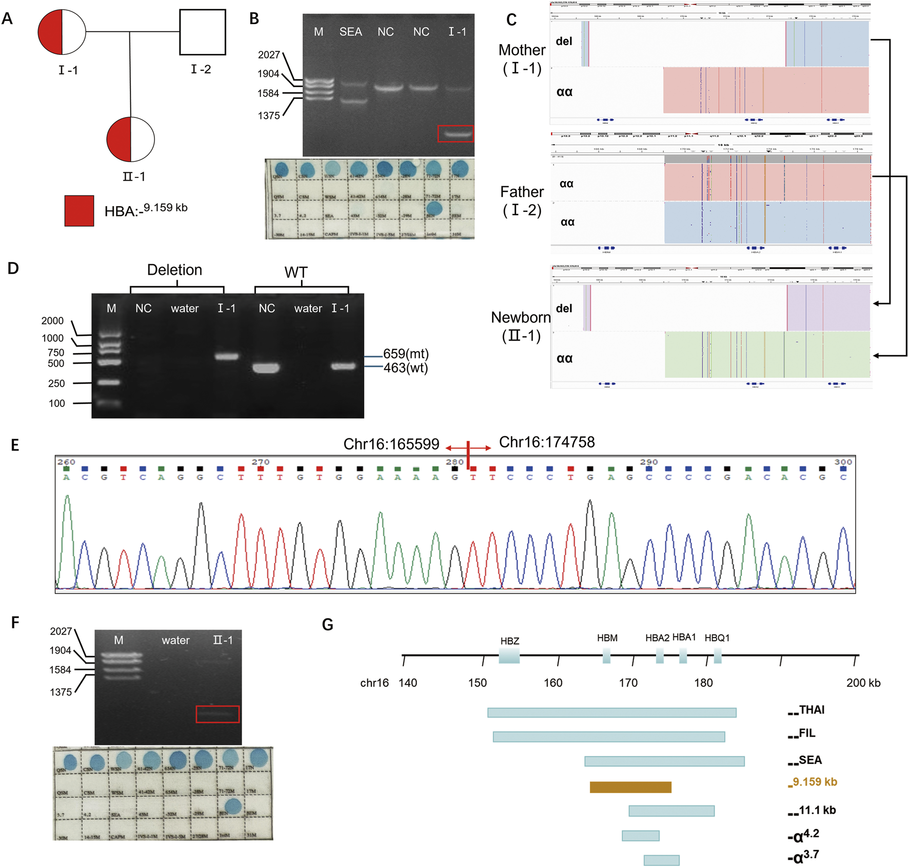 Results of the thalassemia genetic test. (A) Pedigree of the family. The proband (I-1) and her newborn (II-1) are indicated. (B) Conventional thalassemia genetic test results for the proband (I-1). Top panel:Gap-PCR result showing an abnormal band (rectangle). Bottom panel:RDB result showing no common pathogenic variants detected. (C) Integrative Genomics Viewer plot displayed the CCS reads of SMRT sequencing for the family. The newborn (II-1) inherited the deletion (del) allele from the mother (I-1) and the wild-type (wt) allele from the father (I-2). (D) Validation of the heterozygous deletion by Gap-PCR. A specific primer pair (flanking the region chr16:168803-183737, GRCh38/hg38) was used to amplify the 9.159-kb deletion. (E) Sanger sequencing chromatogram confirming the exact breakpoints of the deletion in the proband (I-1). (F) Conventional thalassemia genetic test results for the newborn (II-1). Top panel:Gap-PCR result showing an abnormal band (rectangle).Bottom panel:RDB result showing no common pathogenic variants detected. (G) The 9.159-kb large deletion and other common deletions were displayed in the α-globin gene cluster.Note: NC: nomal control, del: deletion, mt: mutant, wt: wild type.